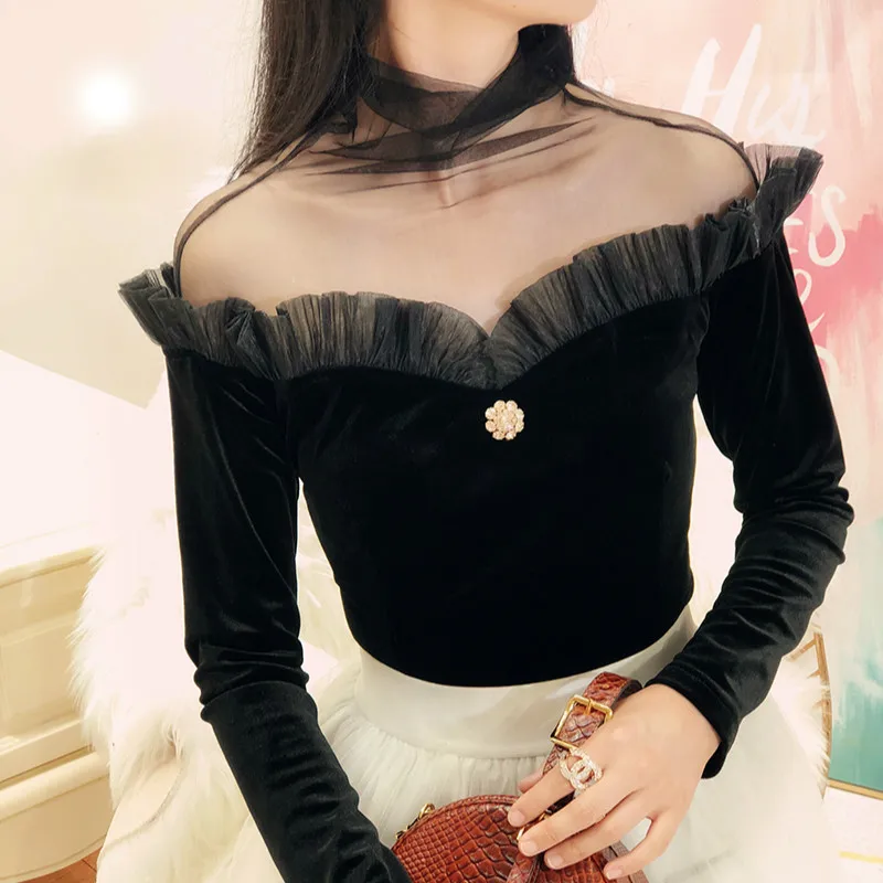 Отзывы о Женская винтажная велюровая рубашка облегающие сетчатые Топы с длинным рукавом