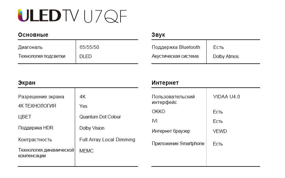 Телевизор 50 дюйма Hisense 50U7QF 4K ULED Smart TV 5055inchtv Электроника - купить