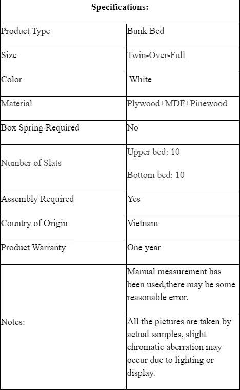 Если вам нужно дополнительное спальное место или ваши дети любят спальные места, эта двухъярусная кровать с двумя спальнями идеально подходит для вашего дома. Пара ящиков под нижней кроватью обеспечивает достаточно места для хранения игрушек и постельных принадлежностей ваших маленьких. Высокое качество, прочные сосновые ножки и прочная оправа обеспечивают стабильность и долговечность для долгосрочного использования и могут быть разделены на один двухразмерный и один полноразмерный кровать. Комплект Slat включает в себя так что пружины коробки не требуются. Двухъярусная кровать с чистым силуэтом и элегантным оттенком. Он подходит для всех стилей домашнего декора и дополняет внешний вид любой спальни. V [максимальное пространство] двухъярусная кровать занимает минимальное пространство для спонтанного гостя. Еще лучше, пара выдвижных ящиков предлагает свободное пространство для одежды и рассказов перед сном внизу. Функциональная и эстетичная, эта двухъярусная кровать улучшит любую спальню. V [универсальность galore] Эта двухъярусная кровать имеет одну двухъярусную верхнюю и одну полноразмерную нижнюю койку для размещения ваших детей или любых ночнушек. Его также можно разделить на две отдельные кровати для еще большего удобства, в зависимости от того, как вы хотите организовать свое пространство. Не требуется пружинная коробка. V [прочная конструкция] конструкция кровати изготовлена из высококачественной твердой сосновой древесины, твердых сосновых ножек и прочной рамы, чтобы кровать была прочной и долговечной. V [предназначен для безопасности вашего ребенка] верхняя двухъярусная кровать имеет Полноразмерное ограждение, в то время как нижняя двухъярусная кровать предназначена для размещения изголовья и подножек. Более того, прочные ножки, изготовленные из твердой сосновой древесины, могут повысить прочность и долговечность. V Размеры: верхний двухъярусный-75,9 ”x 39,1” (Д x Ш). Нижняя двухъярусная-75,9 ”x 54,3” (Д x Ш). Матрас не прилагаются. Требуется некоторая сборка, хотя мы предоставили четкие инструкции и инструменты. Если у вас есть какие-либо вопросы, пожалуйста, не стесняйтесь связаться с одним из наших дружественных клиентов