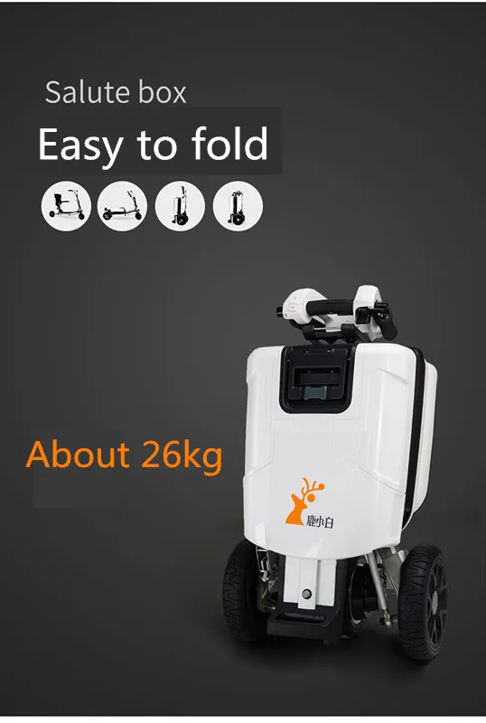 1.Speed:≤8km/h 2.Loading capacity:120kg 3.slop:≤12° 4.Material:Magnesium alloy 5.Distance:25-30km 6.Power:350w 7.Battery:lithioum battery 8.Lithium battery:36V2.2AH 9.Weight:26kg