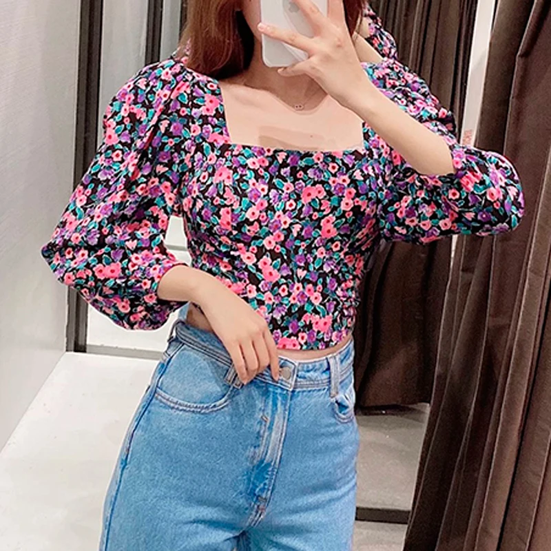 Новинка, женская укороченная блузка с цветочным принтом, Женская винтажная эластичная блузка с квадратным воротником и длинным рукавом на спине, шикарные топы, blusas mujer