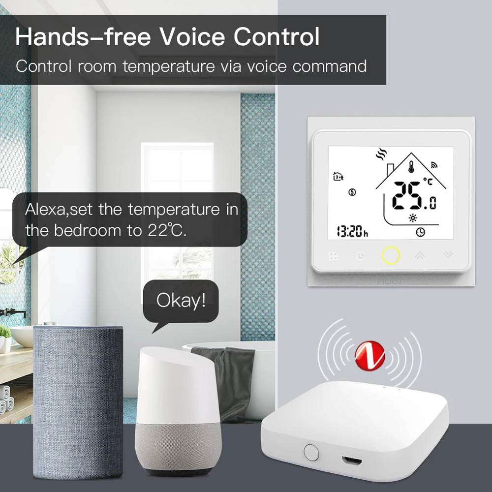 Голосовое и дистанционное управление для беспроводного шлюза Tuya ZigBee подключено: Поддержка дистанционного управления через приложение с помощью вашего интеллектуального телефона, вместе с голосовым управлением без рук через Alexa и Google Assistant после успешного подключения термостата к приложению Smart Life на базе одного беспроводного шлюза Tuya ZigBee.