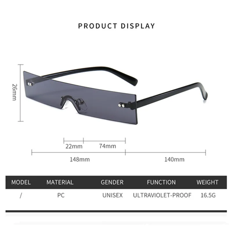 Солнцезащитные очки-это современный значок, который может украсить ваш образ и предотвратить ультрафиолетовое излучение. В солнечный день-сильный ультрафиолетовый светильник, необходимый для защиты ваших глаз. Подходит для унисекс, благодаря чему они будут выглядеть модно и стильно. Отлично подходит для пляжного отдыха, загара или активного отдыха. Вы можете выбрать различные цвета. Удобная носоупор позволит вам носить его в течение длительного времени, и вы не почувствуете усталости. Дизайн без оправы особенный и привлекательный, кроме того, с этими солнцезащитными очками вы сможете четко видеть взгляды. Тип товара: солнцезащитные очки Цвет: серый, желтый, зеленый, розовый, синий Материал оправы: ПК Пол: женщин Стиль: Модный Общая ширина: 148 мм Ширина линз: 74 мм Высота линзы: 26 мм Ширина моста: 22 мм Длина дужки: 140 мм Посылка входит: солнцезащитные очки 1 шт.