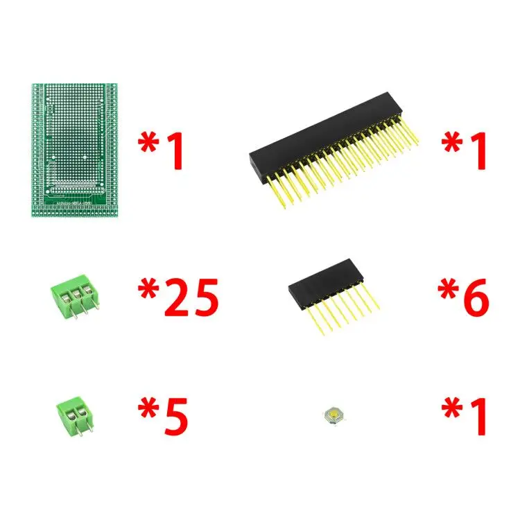 В комплект входят прототип печатной платы, клеммные колодки, гнездовые разъемы.