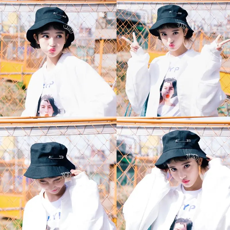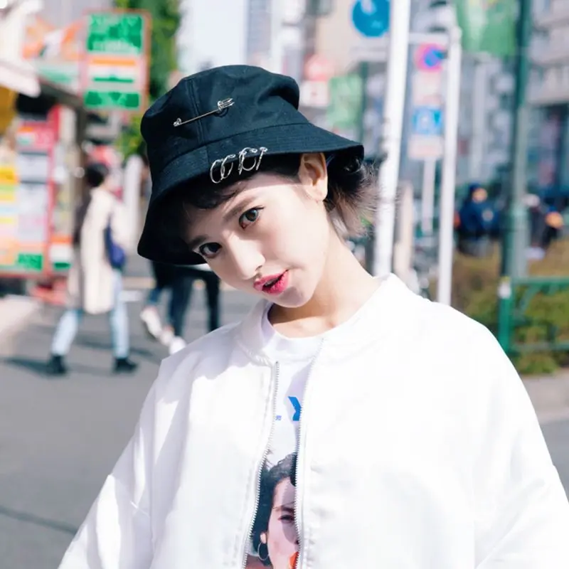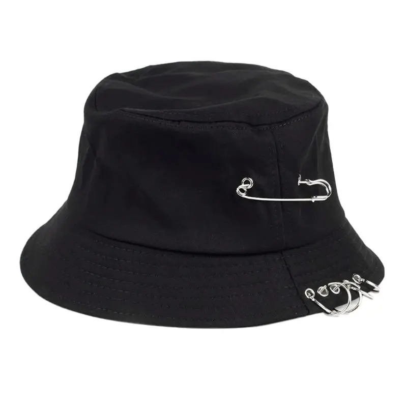 Модные тенденции и в стиле хип-хоп с изображением ведро шляпа в стиле Харадзюку; В стиле «панк», сплошной цвет, широкополая, металлический штырь и 5 o-украшение из колец.