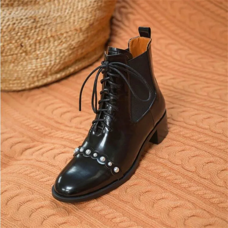 Женские сапоги на толстом каблуке украшенные жемчугом с круглым носком черные - купить