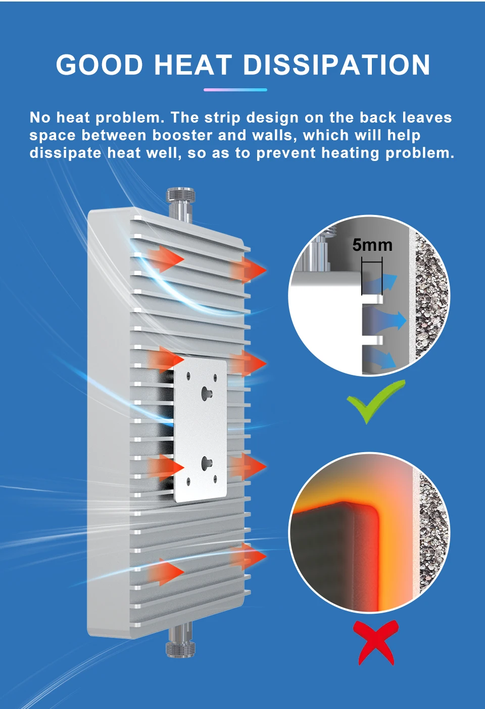 Нет проблем с нагревом. Конструкция полосы на спине оставляет пространство между бустером и стенками, что поможет хорошо рассеивать тепло, чтобы предотвратить проблему нагрева.