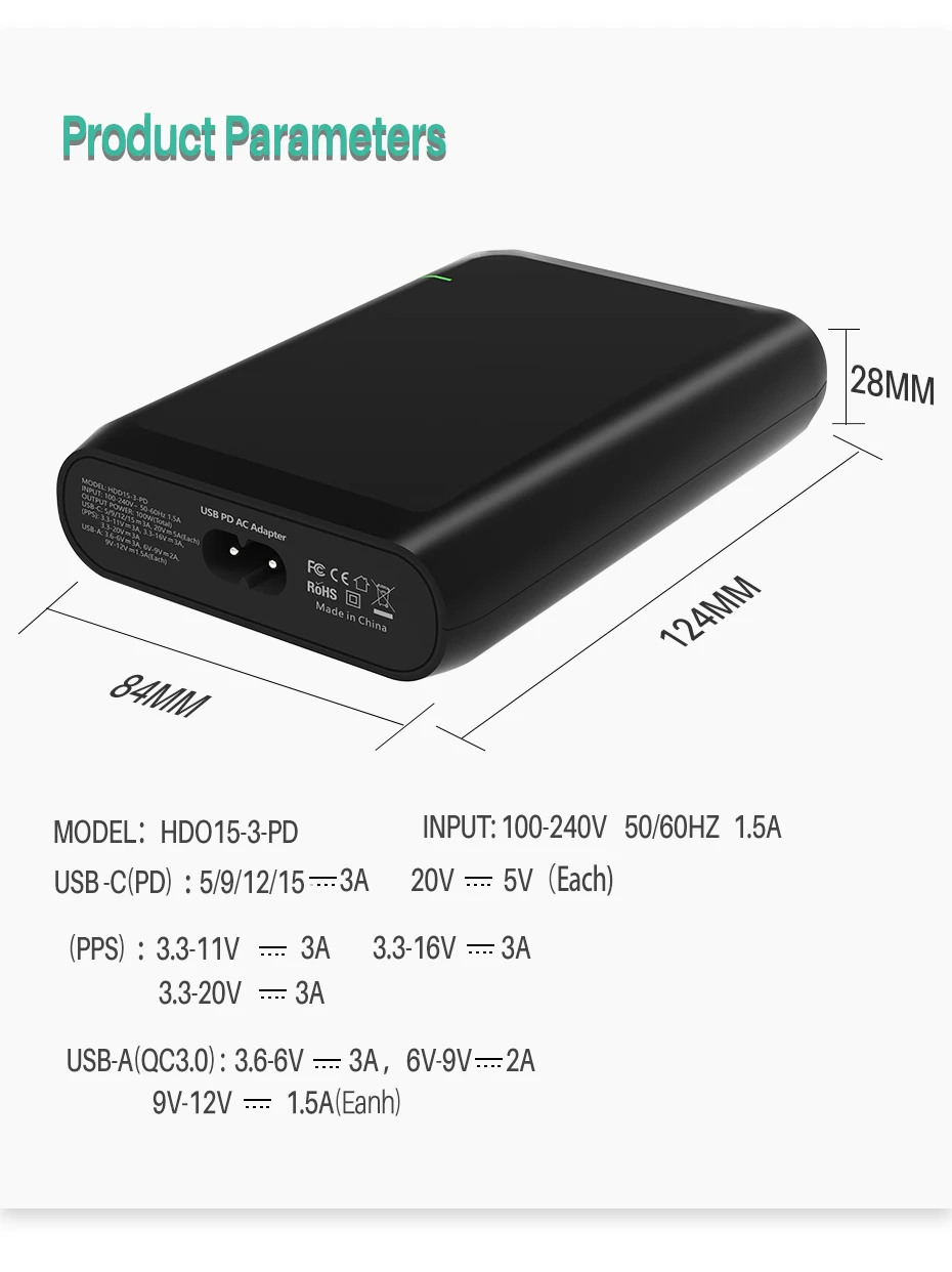 Модель: HDO15-3PD Входное напряжение: 100-240V 50/60HZ 1.5A USB-C(PD) : 5/9/12/15-3A 20V-5V (каждая часть)