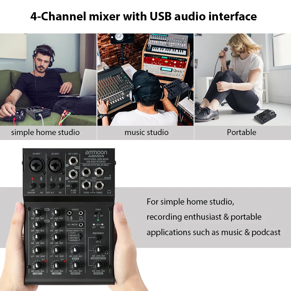 4-канальный видеорегистратор компактный размер микшерный пульт предназначен для домашней студийной записи, сети в прямом эфире, караоке, и т. д.; 5V низшее напряжение источника питания дизайн, может быть питание от компьютера, адаптер питания или блок питания 5 в через разъем USB 2,0 или разъем Micro USB.
