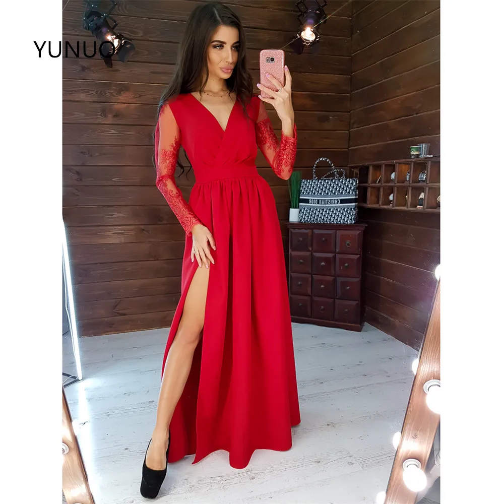 Купить YUNUO красное платье макси для выпускного вечера с кружевом Вечернее длинными