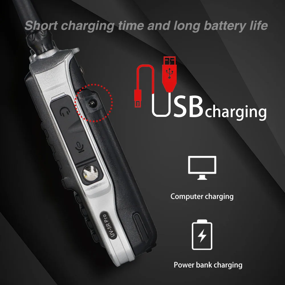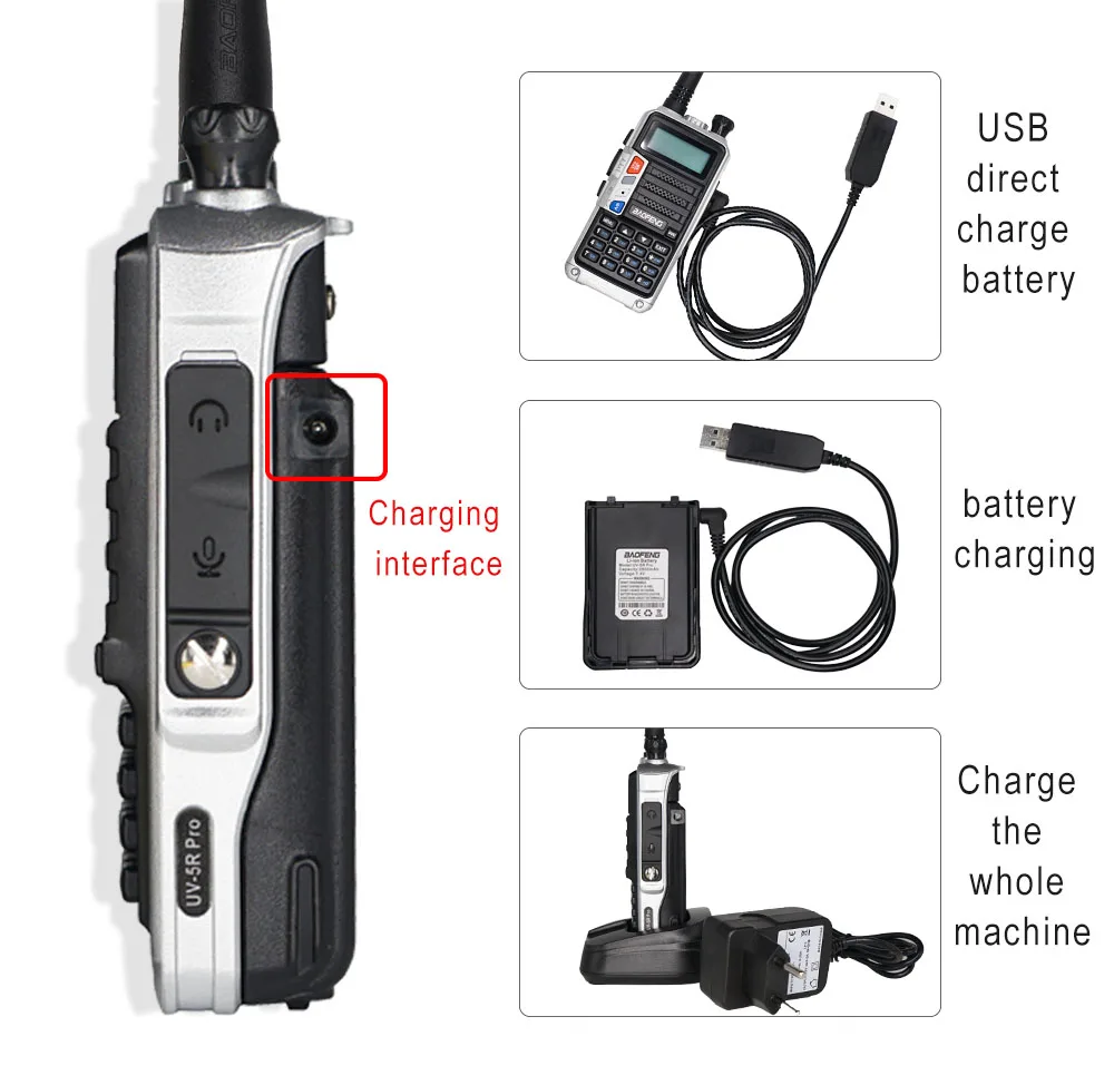 2.Baofeng UV-5R Pro Tri-Band-это мощная рация aslo 8 Вт. С дополнительными способами зарядки аккумулятора. Но стандарт не включает usb-кабель и автомобильное зарядное устройство. Если вы хотите купить соответствующие аксессуары, вы можете купить его по вышеуказанной информации. И вы можете связаться с нами.