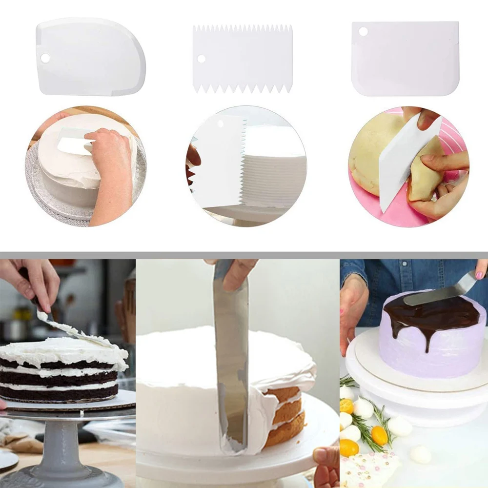 Идеальное сочетание украшения торта поставляет дополнительные 2 глазурные лопатки (прямые и изогнутые) и набор из 3 пластиковых скребок для торта.