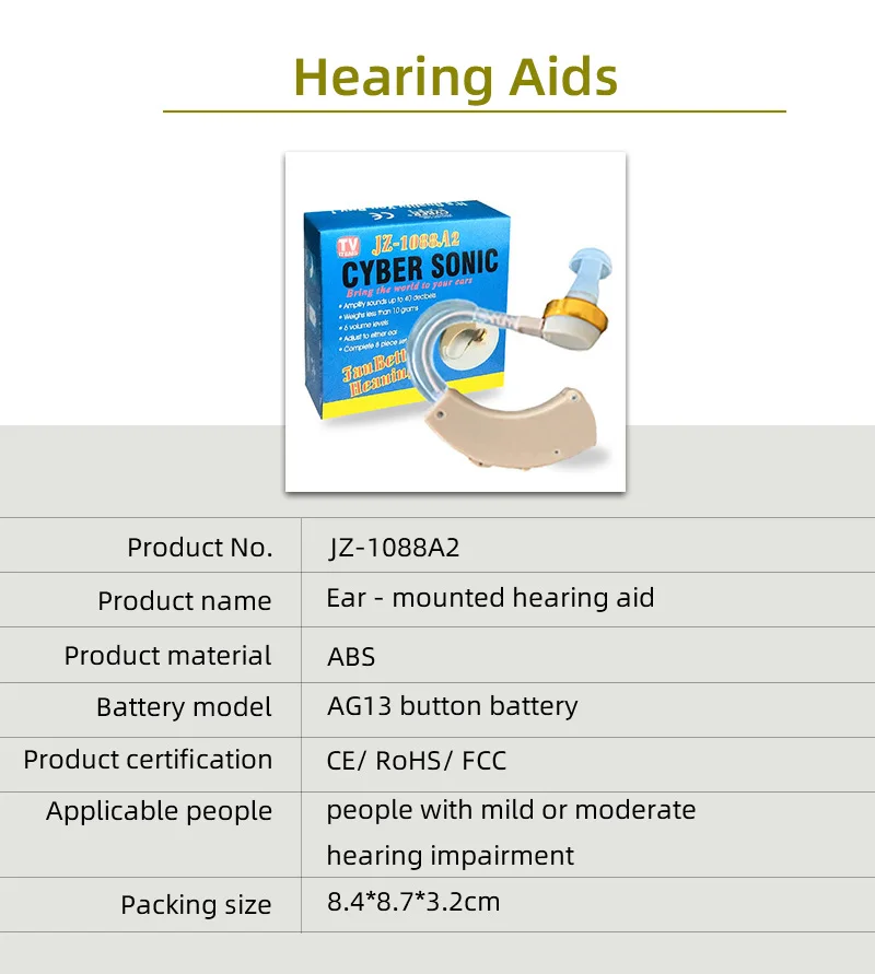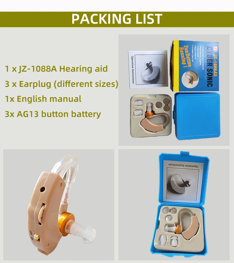 1 x JZ-1088A слуховой аппарат 3 х Заушник (разные размеры) 1x руководство на английском языке 3x AG13 кнопочный аккумулятор