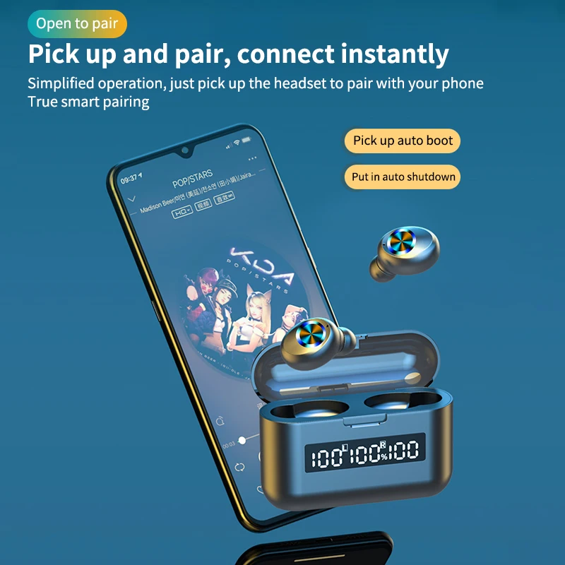 Спецификация продукта: 1. Спецификация Bluetooth: V5.0 2. Профиль Bluetooth: A2DP,AVRCP, HFP;HSP 3. Рабочее напряжение: 3,1 В ~ 4,2 В 4. Напряжение зарядки: 5V-1A 5. Емкость аккумулятора гарнитуры: 50 мА · ч 6. Емкость аккумулятора ящика: 2000 мАч 7. Расстояние передачи:>10 м 8. Время вызова: 4-5 ч 9. Время воспроизведения: 4-5 ч 10.Waterprof :IPX7 11. Время зарядки гарнитуры: 30-45 мин 12. Время зарядки зарядного устройства: 1 ч Продукты включают в себя 1 * одна пара bluetooth-гарнитур 1 * зарядное устройство 1 * зарядный кабель 1 * Руководство пользователя 4 * Ушная крышка