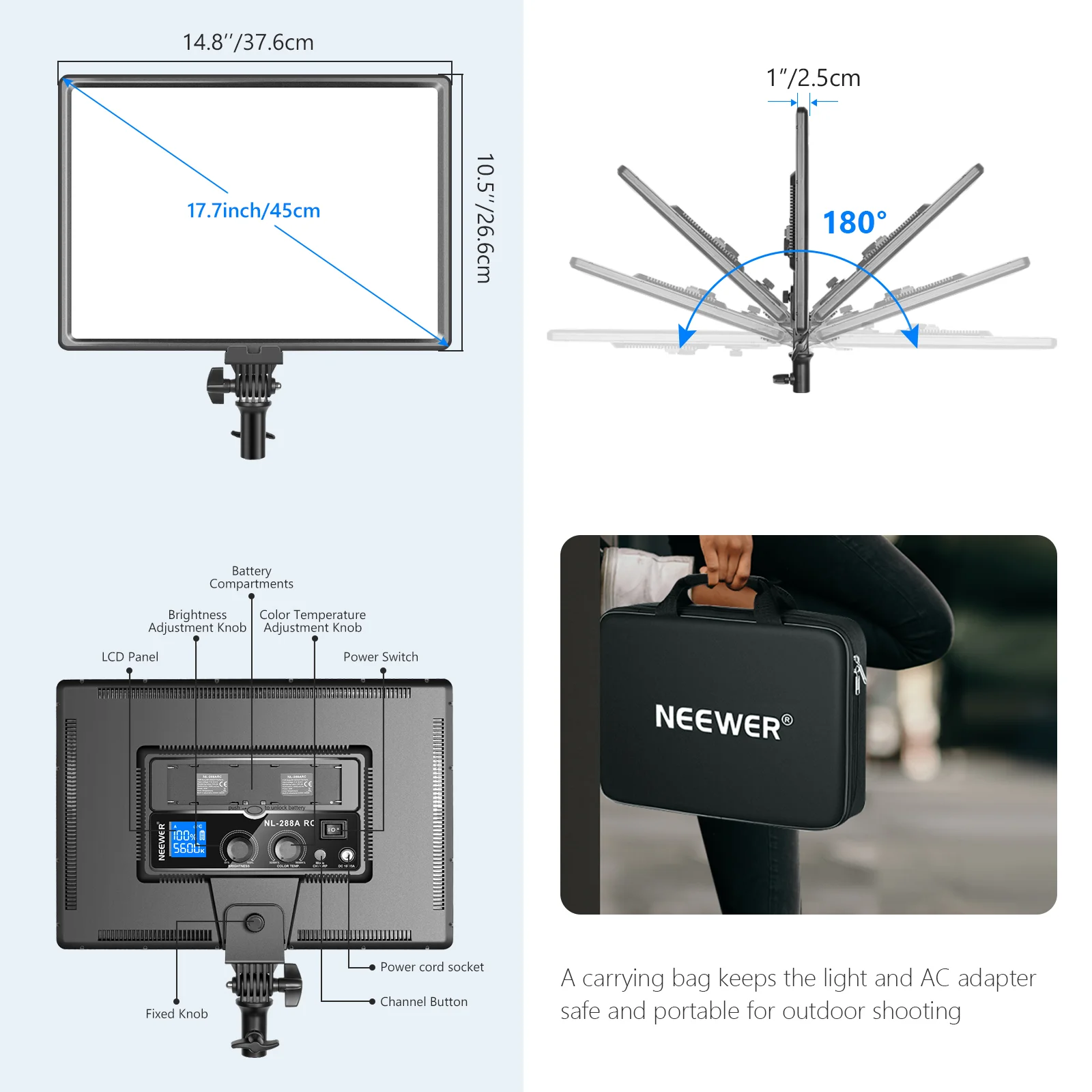 Простота установки и широкое использование: размер панели (без кронштейна): 14,8x10,5x1 дюймов/37,6x26,6x2,5 см, Вес нетто: 38,8 унций/1,1 кг. Поставляется с адаптером для подключения к осветительным подставкам. Сумка для переноски для удобного хранения и переноски