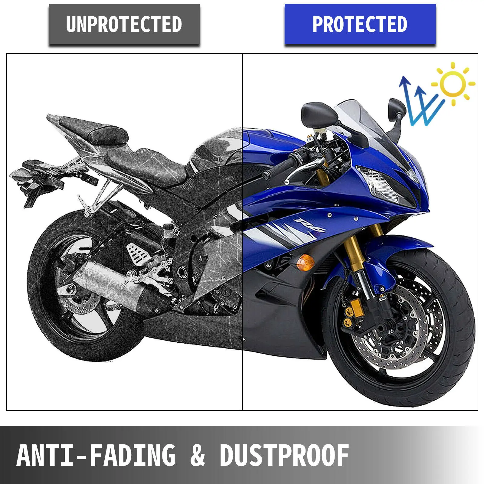 Наш чехол для мотоцикла использует ткань Оксфорд 600D, которая толще, чем ткань Оксфорд 210D, более износостойкая и долговечная, и качество лучше, чем большинство чехлов для мотоциклов на рынке. Он также является водонепроницаемым, а защита от снега препятствует воздействию дождя и снега и может 100% защитить ваш автомобиль.