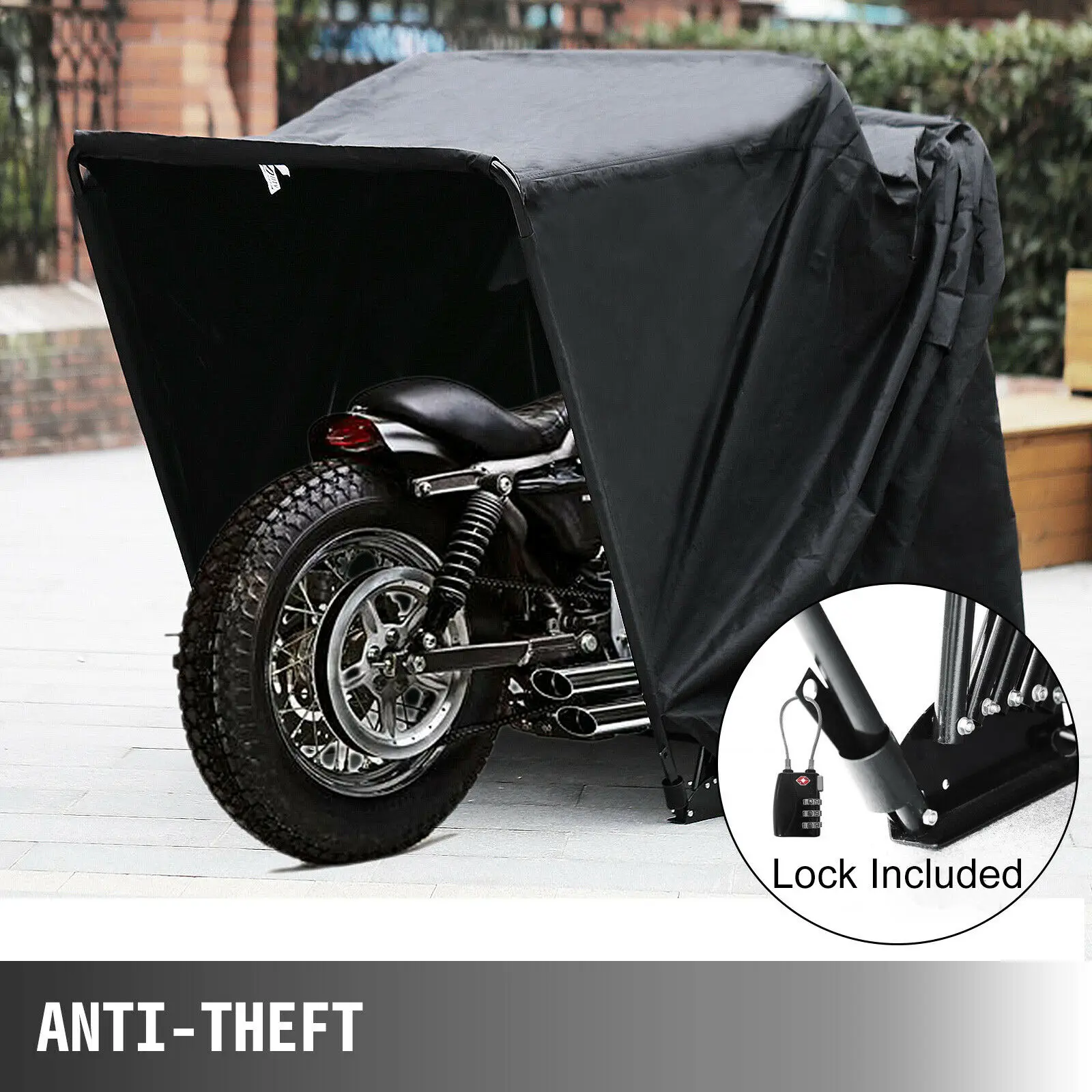 【Высокая безопасность FACTOR】-наш мотоциклетный шатер может стоять вертикально на земле из-за рамы, или он может быть закреплен на земле с помощью болтов, чтобы противостоять более тяжелой погоде и природной среде. Конечно, вы также можете настроить навесной замок, так что существует двойная защита, никто не может повредить ваш автомобиль, предоставляя вам 100% защиту.