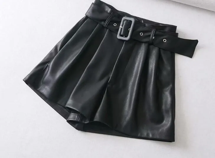 Отзывы о Модные женские шорты из искусственной кожи с высокой талией и поясом черные