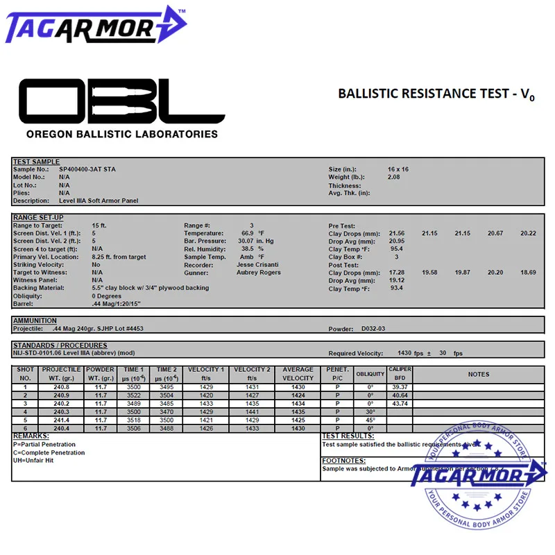 Уровень защиты: стандарт NIJ-0101,06 уровень IIIA (NIJ IIIA 9 мм и. 44 Mag)