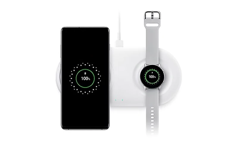 Беспроводное зарядное устройство Duo Pad также может заряжать ваши Смарт-часы Samsung. Gear S3, Gear Sport и Galaxy Watch могут заряжаться в том же месте, что и ваш телефон, просто размещая часы на зарядной панели.