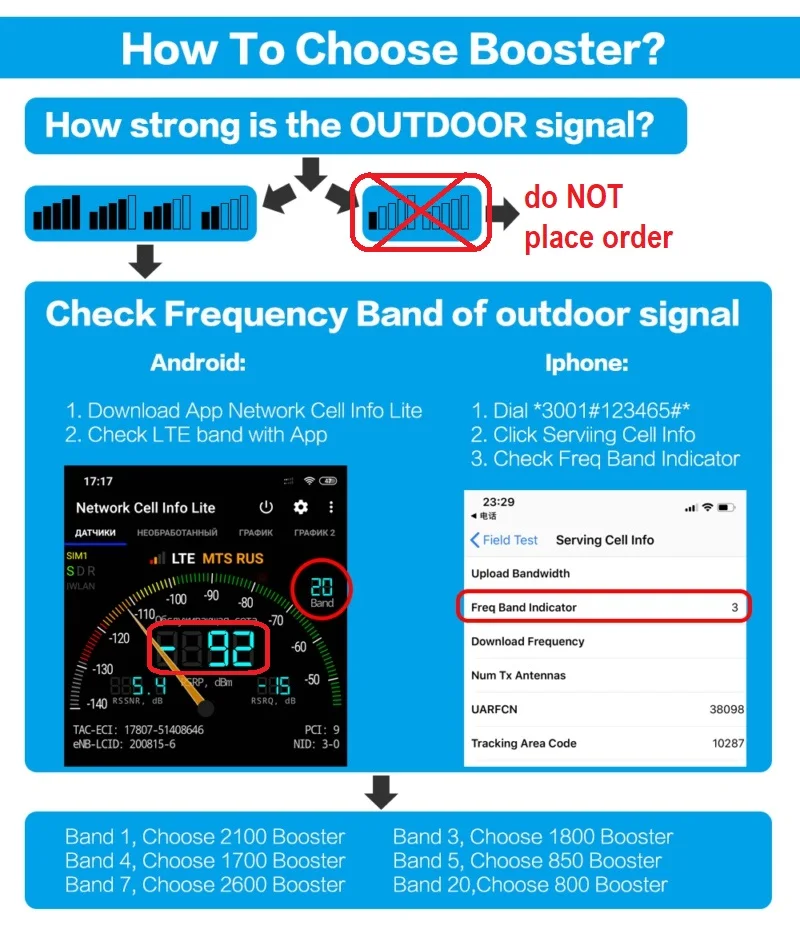 1-убедитесь, что ваш мобильный телефон может получить сигнал лучше, чем -- 95 дБ (4G) за пределами вашего дома, который должен отображать 3 ~ 5 бар. Если только 0 ~ 1 бар, не покупайте бустер.