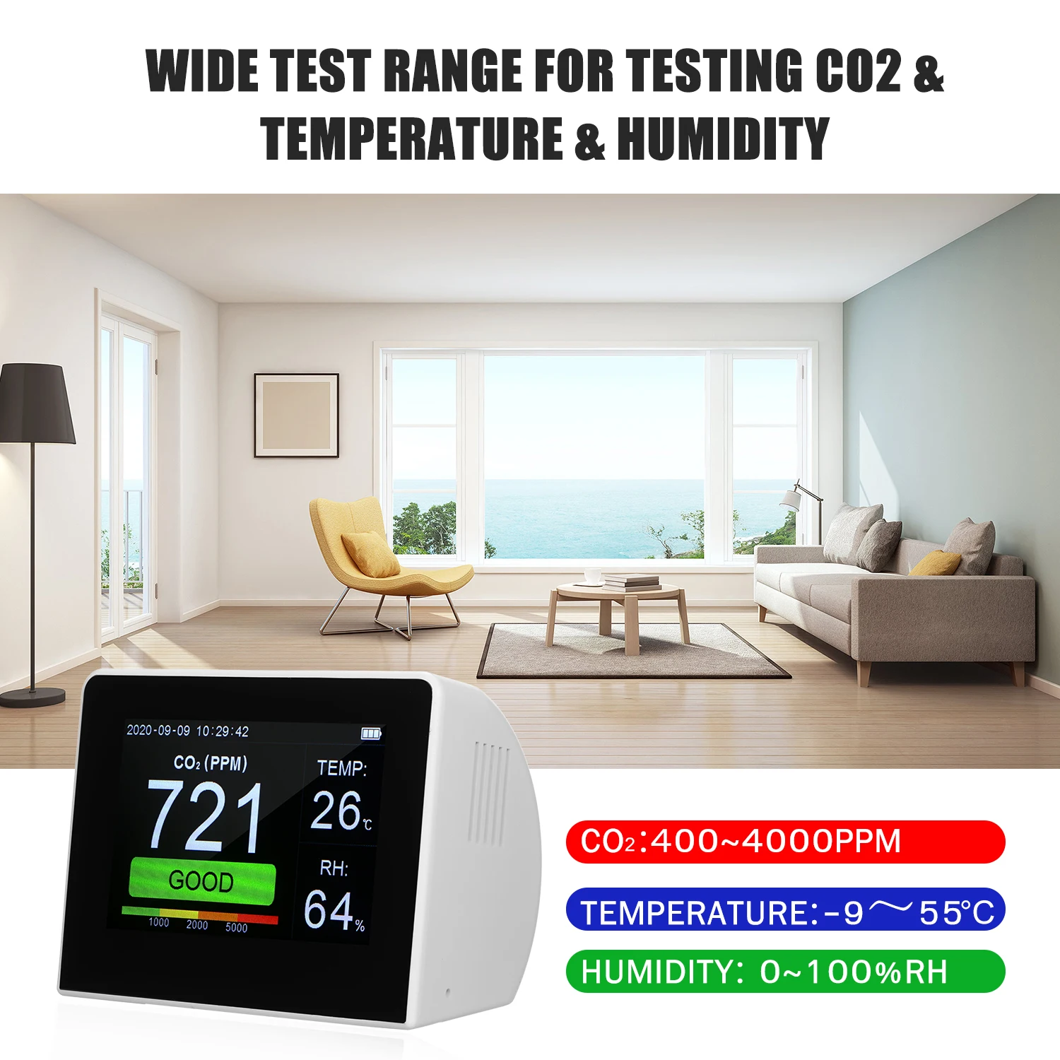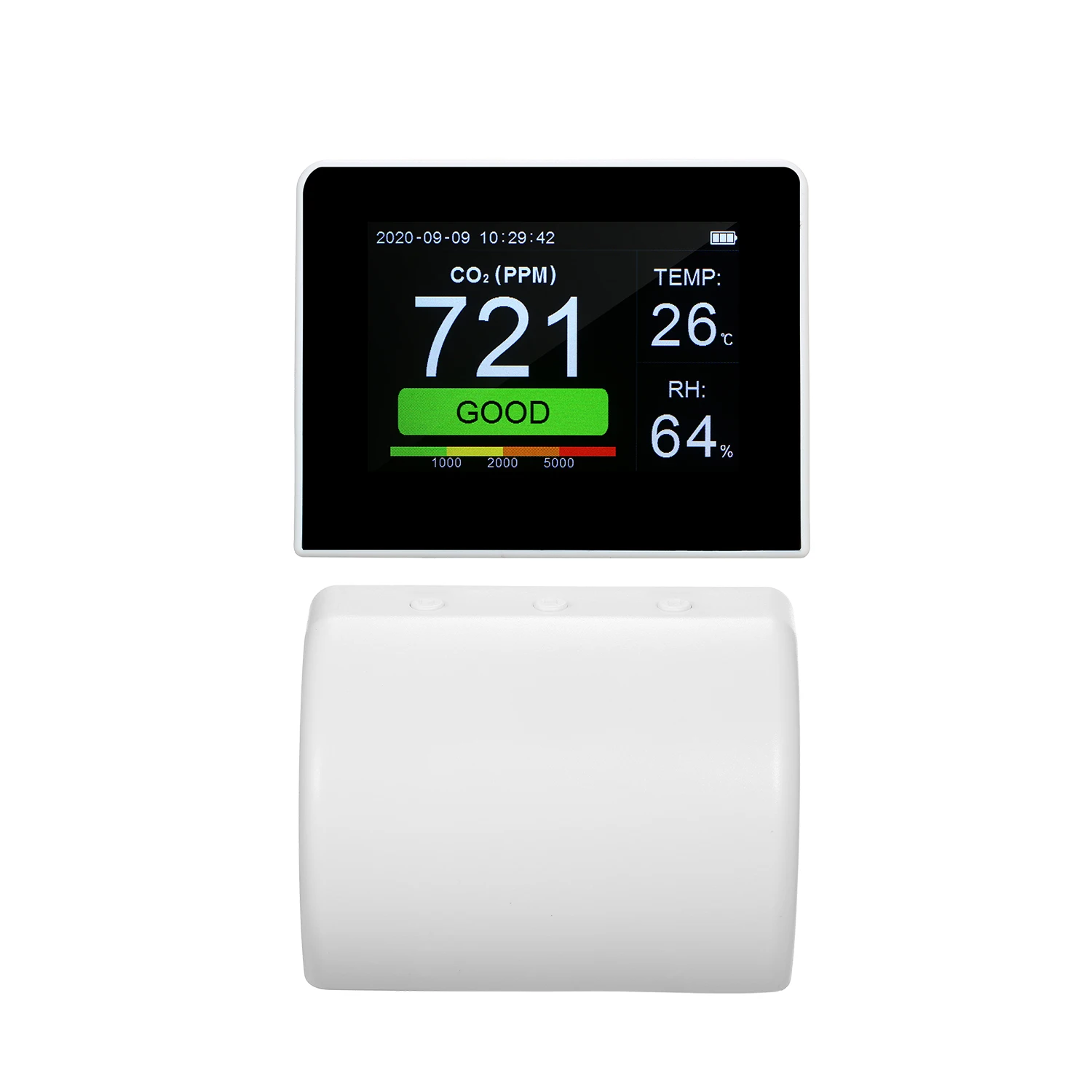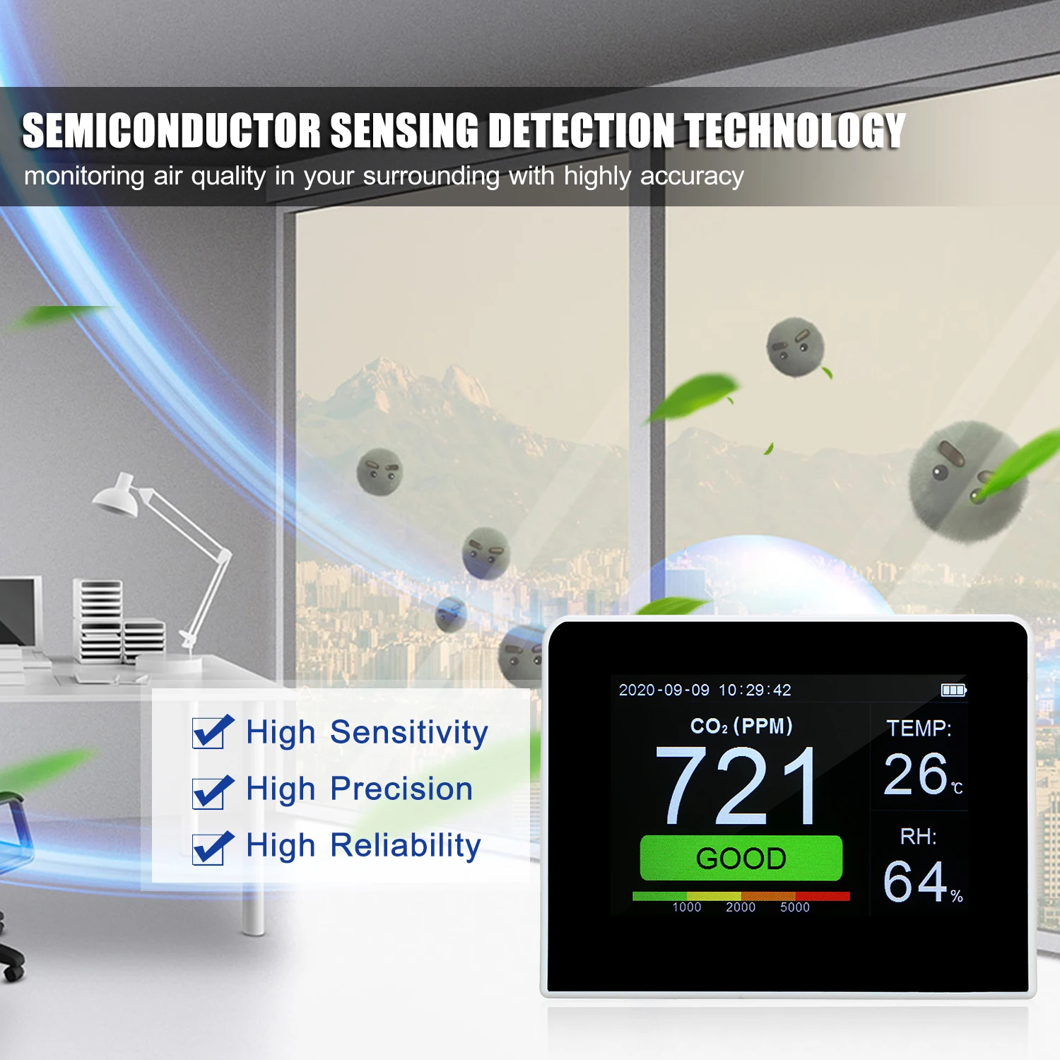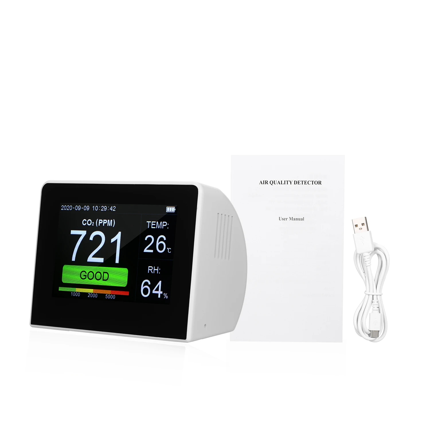 Полезный детектор качества воздуха с быстрой реакцией и высокой точностью для тестирования содержания CO2 в воздухе, который вас окружает, и отображение времени, даты, температуры и относительной влажности в реальном времени.