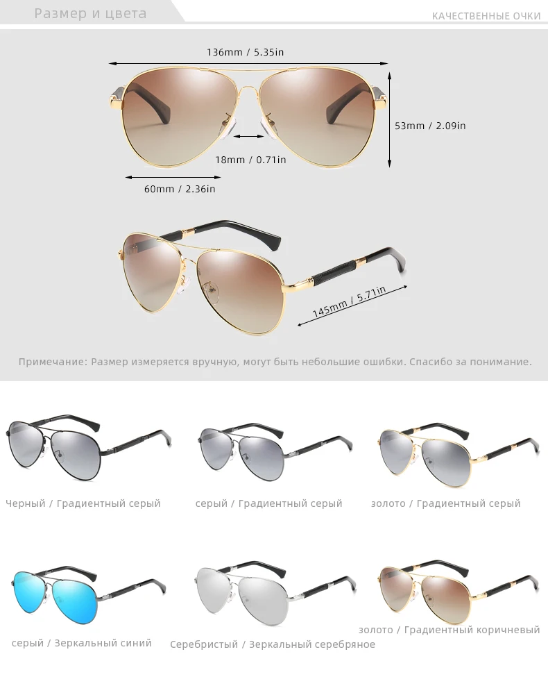 Почему стоит выбрать поляризованные солнцезащитные очки? Поляризованные солнцезащитные очки могут блокировать весь вредный свет, не влияя на пропускаемость визуального света, и действительно могут достичь функции защиты глаз. И поляризованные солнцезащитные очки также имеют Антибликовое покрытие, предотвращают отражение дороги, предотвращают поверхностные весы и т. д., подходят для вождения, рыбалки, путешествий, повседневной носки. Это высококачественные поляризованные солнцезащитные очки в стиле пилота. Мост использует специальные материалы памяти и может сгибаться под разными углами, чтобы адаптироваться к различным фигурам лица. Оправа изготовлена из сплава и сочетается с силиконовой опорой для носа, что делает ее очень удобной в носке. Объектив является взрывозащищенным поляризованным объективом, который безопасен и четче. Эта пара очков может использоваться для дневного вождения и повседневного ношения. Особенности линз • Polaroid • 100% защита от ультрафиолета • Градиентные линзы • Зеркальные линзы Особенности рамы • Сплав + металлический каркас моста памяти • Силиконовые носоупоры • Усиленная система петель О размере Ширина оправы: 136 мм/5,35 дюйма Ширина линз: 60 мм/2,36 дюйма Высота линз: 53 мм/2,09 дюйма Ширина моста: 18 мм/0,71in Длина дужек: 145 мм/5,7 дюйма