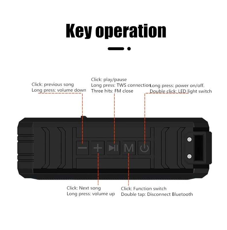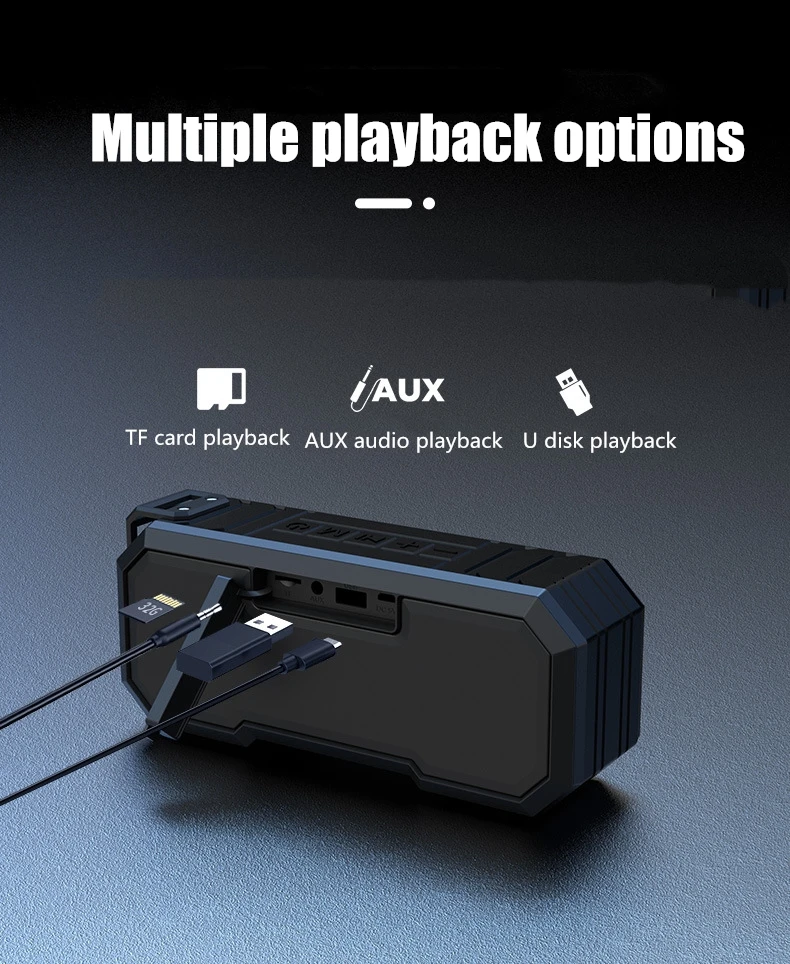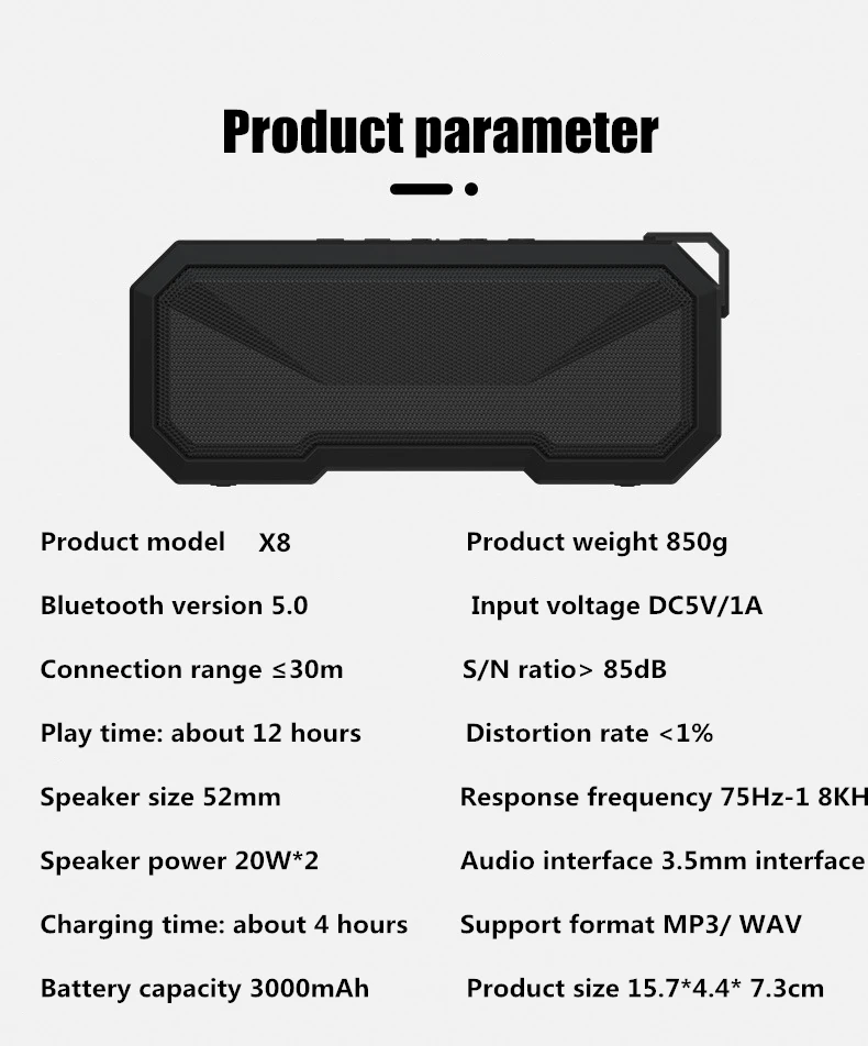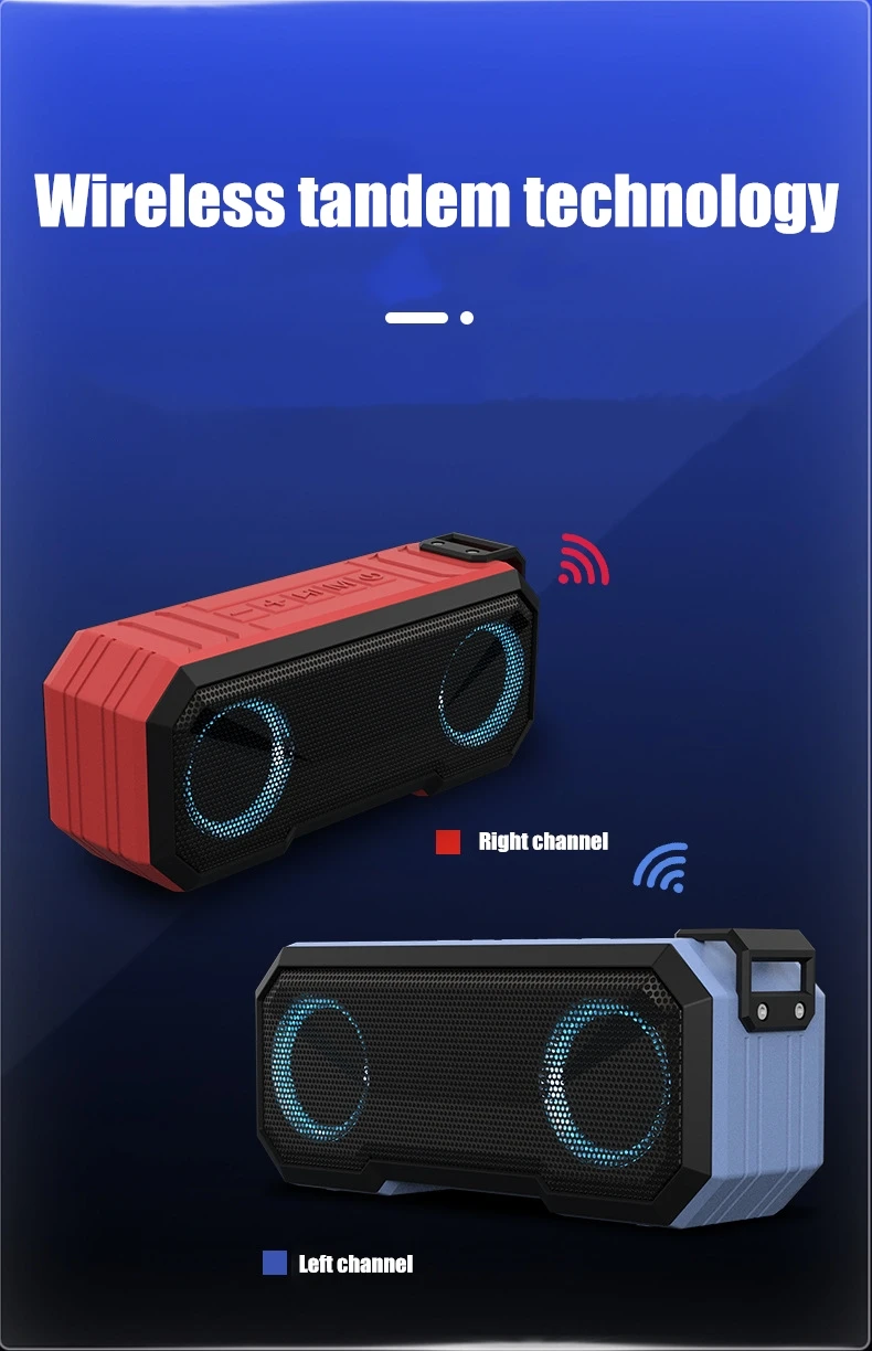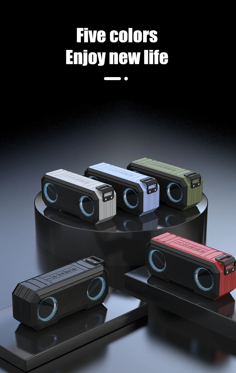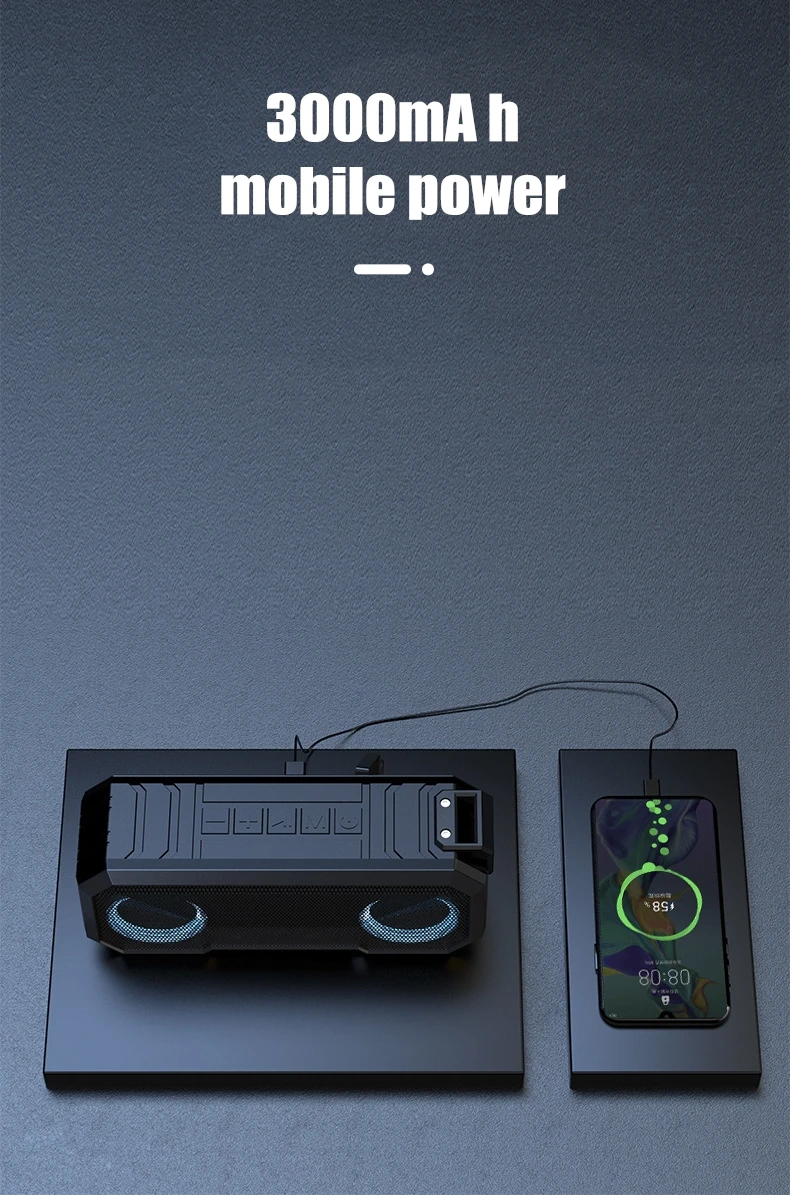 Модель продукта: IPX7 (черный/красный/зеленый/синий/серый) Дальность передачи: безбарьерная 10-30 м Версия Bluetooth: V5. 0 Время использования: 12 часов на средней громкости Решение Bluetooth: Jerry Размер игрушки: 20,5x7x8,5 см Емкость аккумулятора: 3000 мАч Вес изделия: 850 г Характеристики динамика: 52 м * 2 Специальные характеристики: беспроводной Bluetooth, TF-карта, звонок, U-диск светодиодный светильник ка, внешний аккумулятор