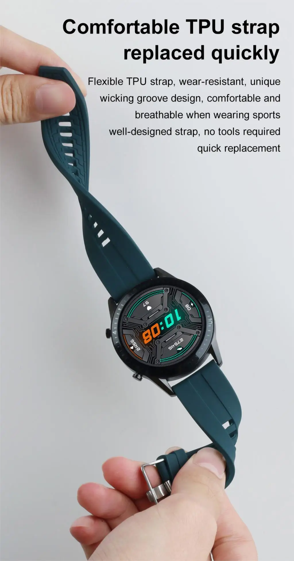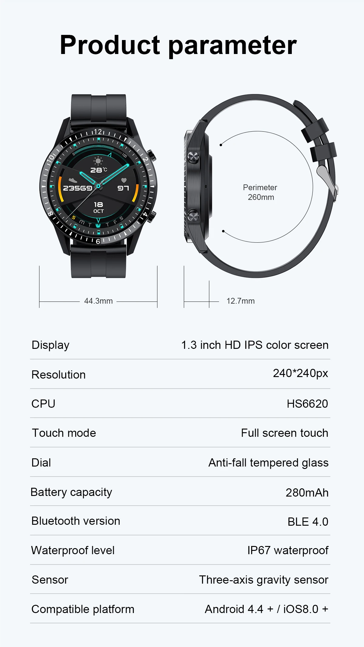 * Другие функции: напоминание о сидячем положении, напоминание о питьевой воде, будильник, удаленная камера, отсчет, Поиск телефона, поднимите запястье на светильник, переключитесь между несколькими циферблатами
