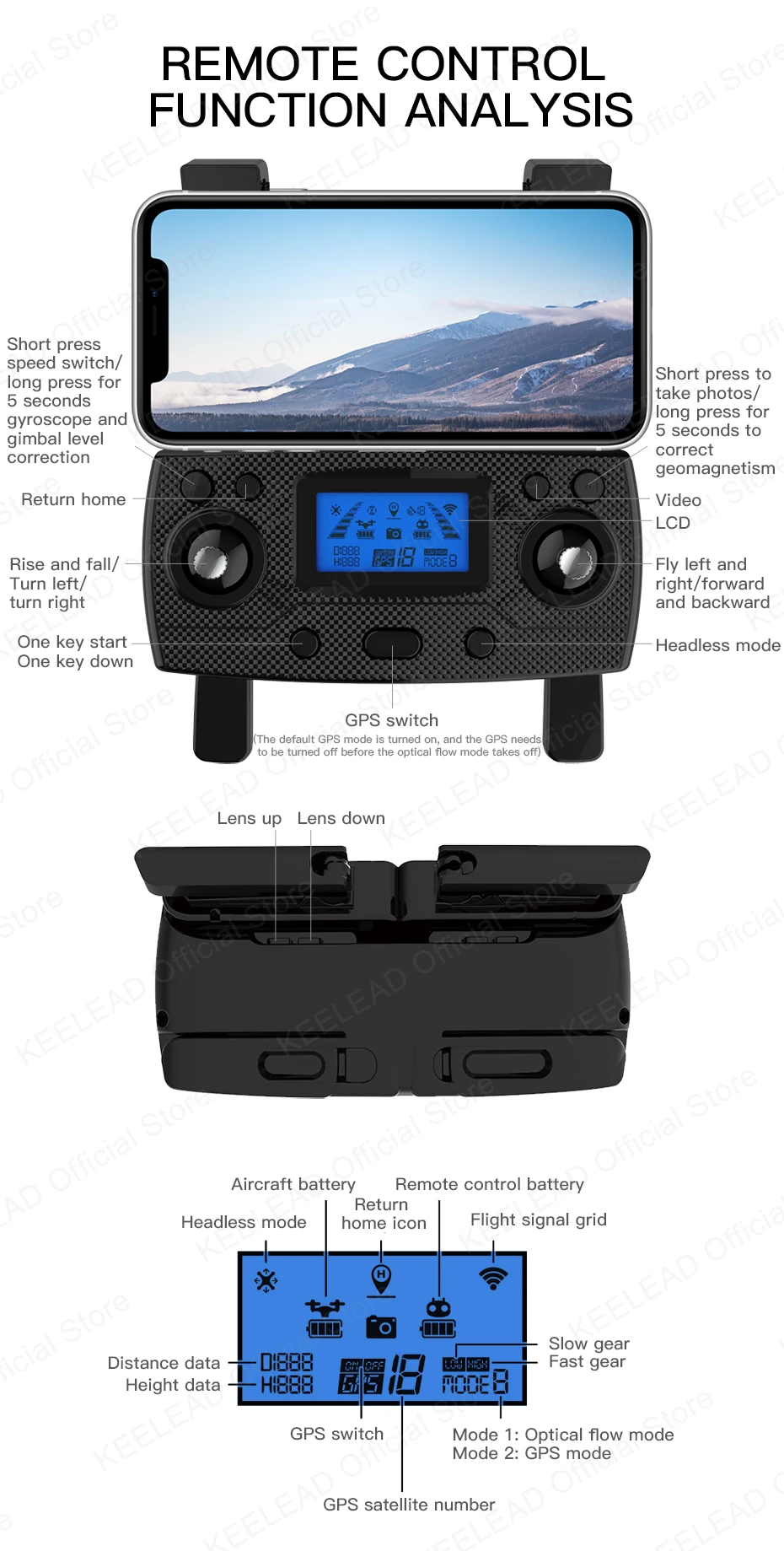 В режиме позиционирования GPS Управляйте самолетом, чтобы летать на расстоянии 5 метров от контроллера, включите функцию приложения, самолет может автоматически следить за движением контроллера и делать снимки Примечание: Эта функция может быть включена в режиме mode2!
