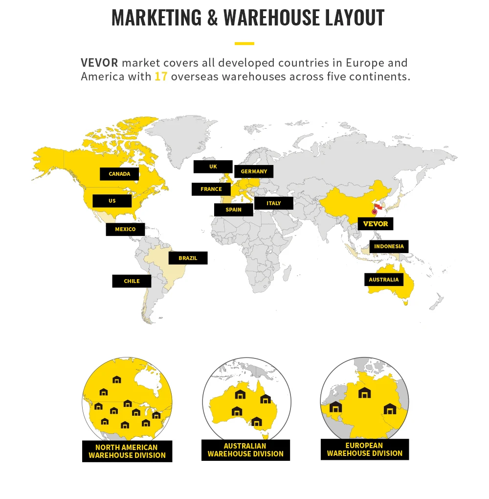 Taicang Vevor Machinery Equipment CO.LTD.We operates more than 1000 kinds of machinery equipment products,and engaged in cross-border business for 15 years.At present,we have more than 600 employees.