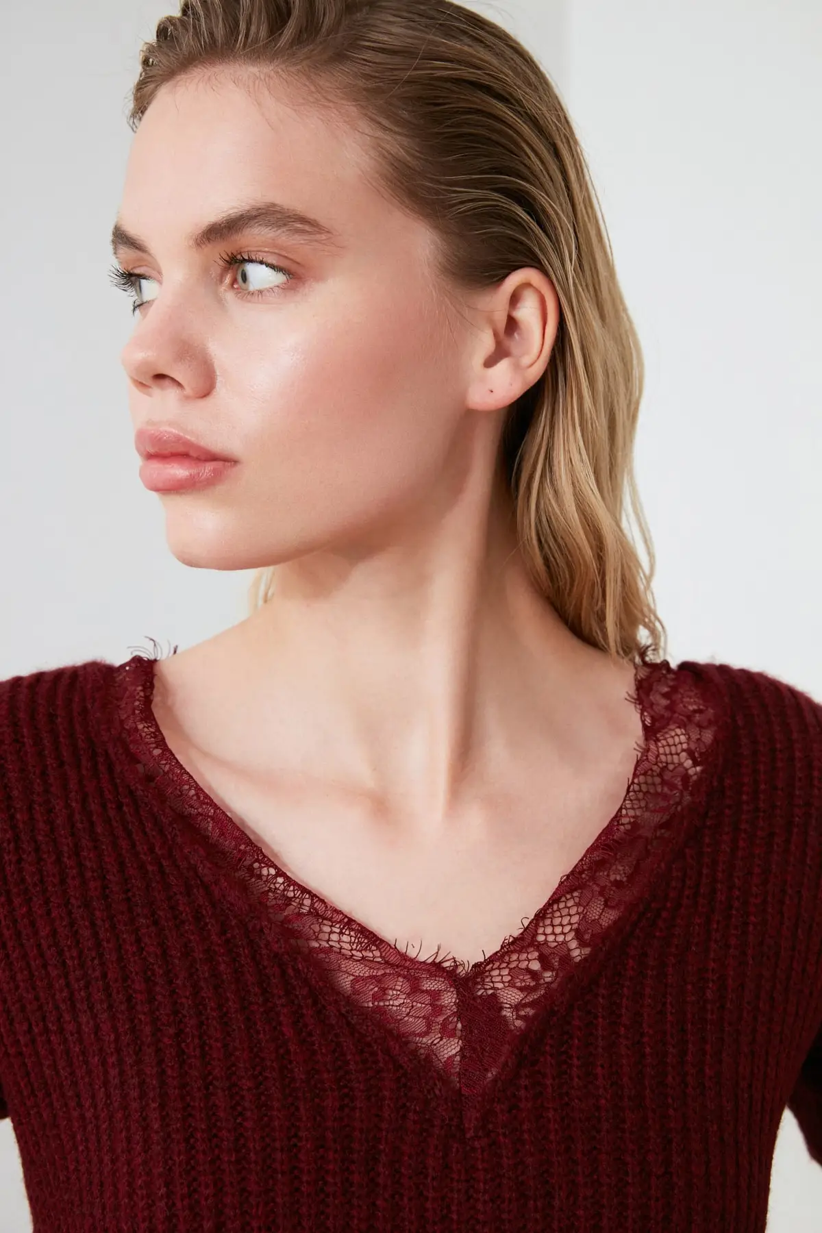 Отзывы о Бордовый трикотажный свитер с V-образным вырезом и кружевом женские пуловеры