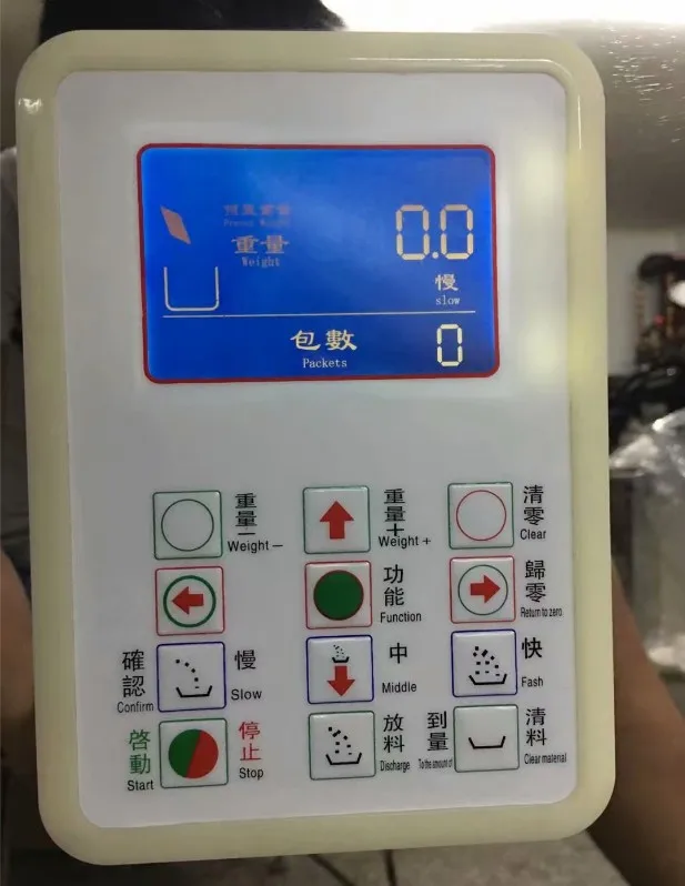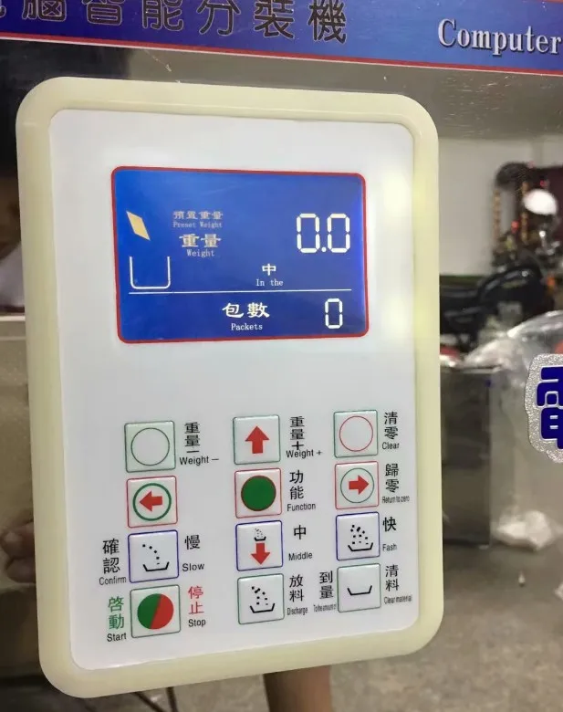 Микросхема компьютера умно контролирует материалы и передает их точным весом. Есть три сорта скорости вибрации, быстрый, средний и медленный. Высокая скорость, высокая производительность, небольшие ошибки. Машина может заполнить Материал 10 г-25000 г в пакете и упаковать его количественно. Вы можете установить количество граммов веса поверх компьютерной доски.
