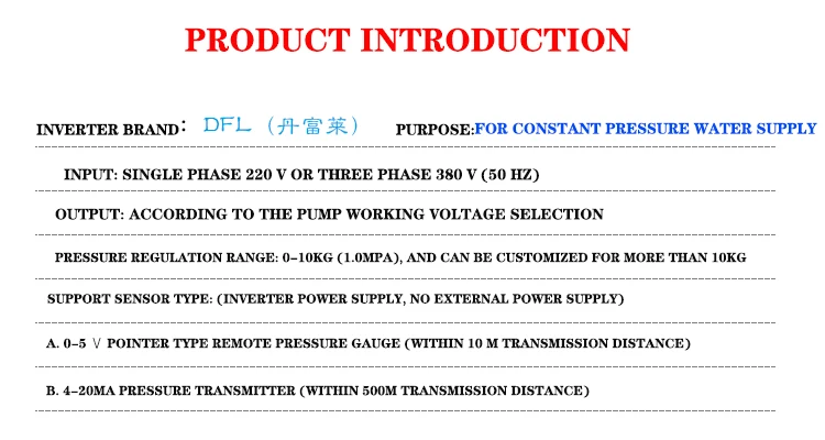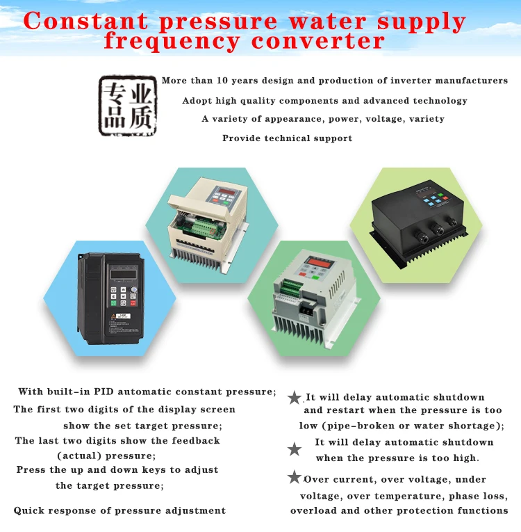 Особенности нашего специального инвертора для подачи воды под постоянным давлением: первые две цифровые трубки основного интерфейса непосредственно отображают установленное давление, а последние две цифровые трубки отображают фактическое давление трубопровода; нажмите кнопки вверх и вниз на панели, чтобы изменить давление цели. И может использоваться для 0-5V Дистанционное манометр, 4-20mA датчик давления и 0,5-4,5 V датчик давления.