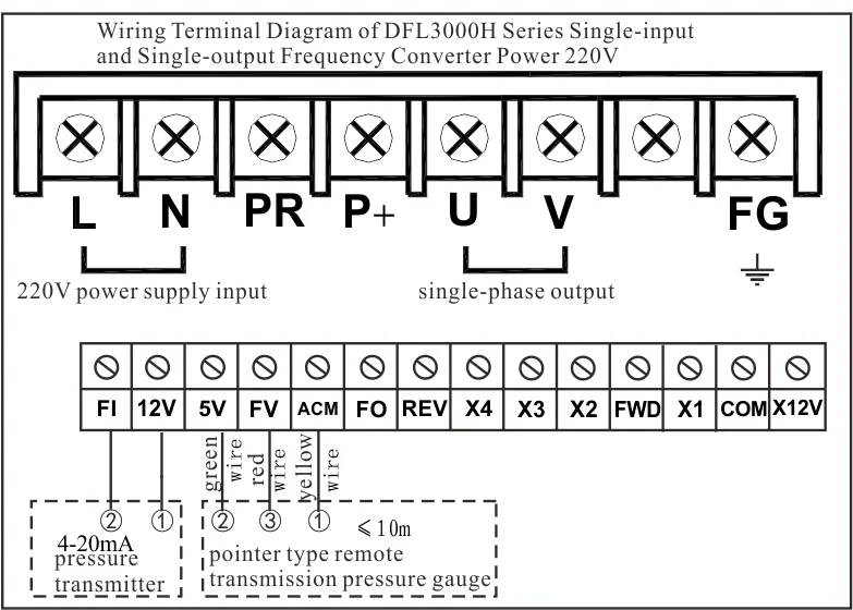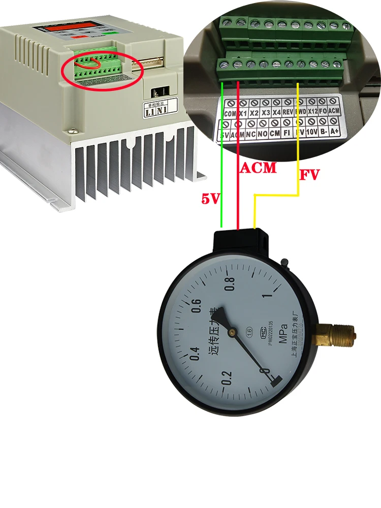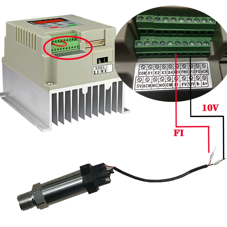 Проводка проста и прост в эксплуатации. В основном, для настройки требуется всего несколько шагов. Значение инвертора по умолчанию составляет 0-5 В. Если вы используете датчик давления 0-5 В, вам нужно только установить диапазон датчика давления PR130. Метод работы выглядит следующим образом: Нажмите программирование---появится pr *** интерфейс ---- Нажмите кнопки направления вверх и вниз, чтобы настроить до pr130 ------- нажмите Сохранить ---- появится d00.60 (6 бар) ---- Измените диапазон вашего сенсора нажатия, например, 1 МПа (10 бар): d01.00-затем нажмите СохранитьЕсли используется датчик давления 4-20 мА, вам нужно изменить: pr000 -- d0003, pr128 ---- d01.00, и максимальный диапазон датчика давления pr130 (метод работы как указано выше)