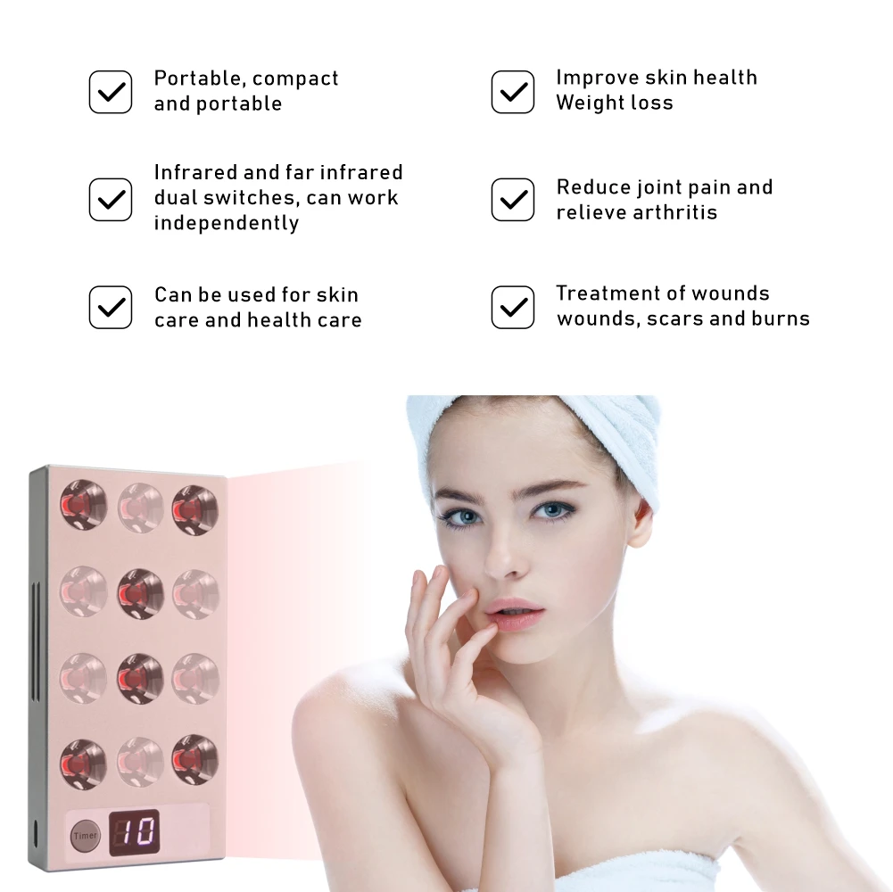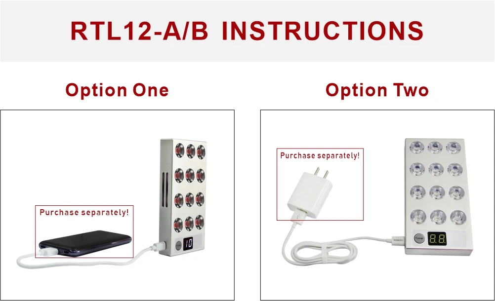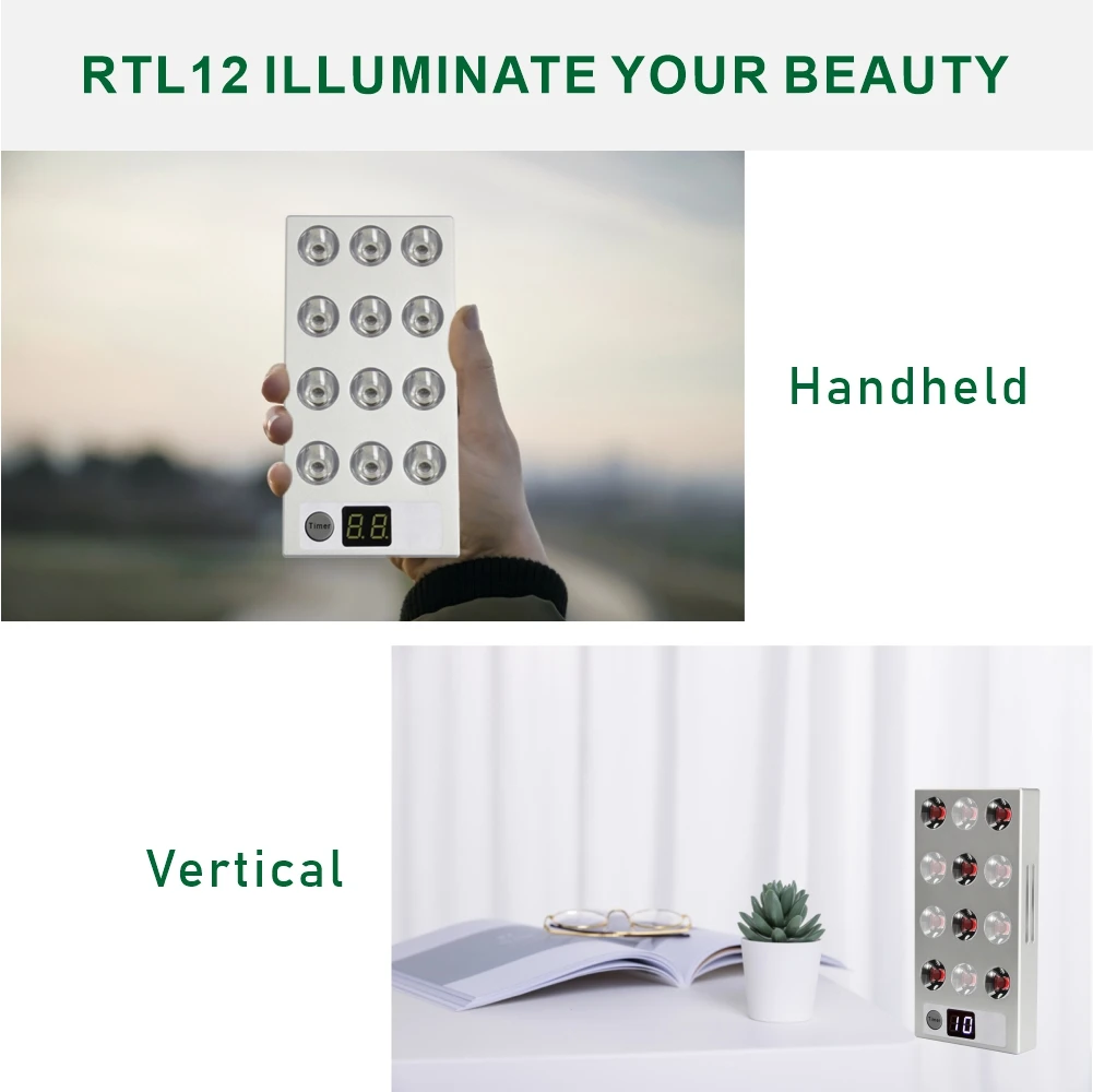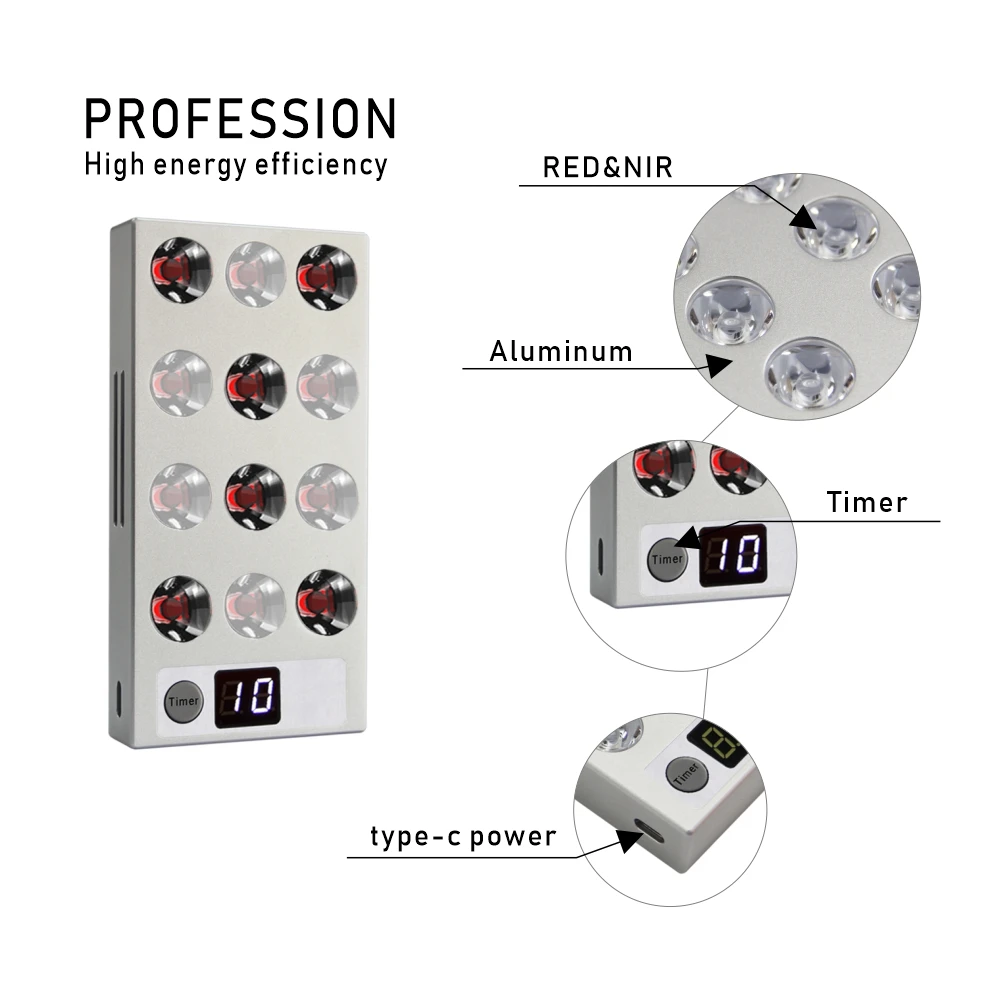 Модель (RTL12-A один чип Без перезарядки 150x76x20 мм 12*3 Вт) (RTL12-B двойной чип без Перезарядка 150x76x20 мм 12*5 Вт) (RTL12-C двойной чип с Перезарядка 150x76x30 мм 12*5 Вт) Спектр: красный, ИК, оба Входное напряжение: 5 В, поддерживает все зарядные устройства на мобильный телефон или банки питания Тип входного сигнала: Тип C Плотность мощности:> 110 МВт/см² @ 8 см discante Гарантия: 2 года Таймер: Да, по умолчанию 10 минут максимум 20 минут или без таймера