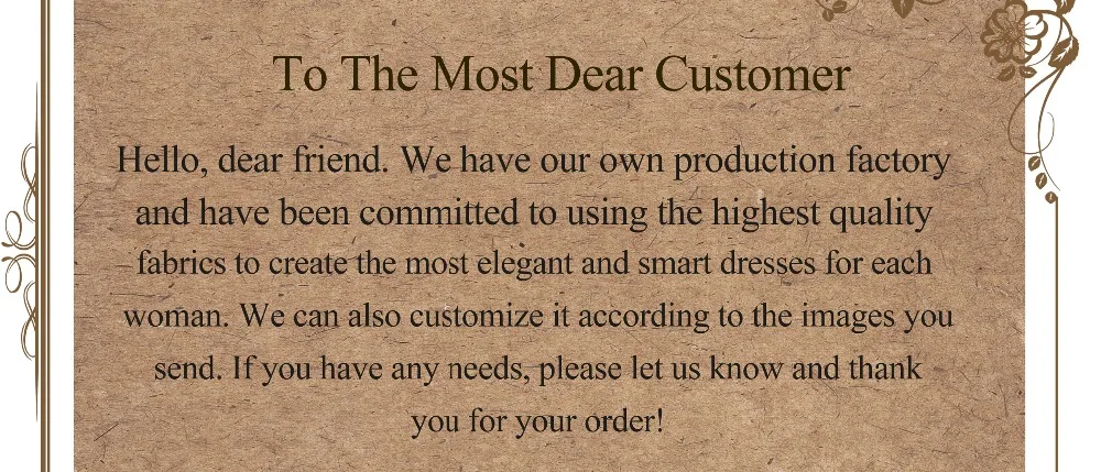 Если вам нужно сделать платье на заказ, пожалуйста, пришлите нам список размеров, как указано ниже:1. Обхват груди = _ см2. Талия = _ см3. Бедра = _ см4. От талии до пола с обувью = _ см5. Длина = _ см (от плеча до пола с каблуком)6. Высота = _ см (от верхней части головы до пола с обувью)7. Длина рукавов и проймы.