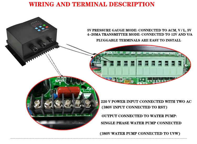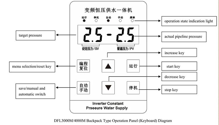 Особенности нашего специального преобразователя частоты подачи воды с постоянным давлением: первые две цифровые трубки на главном интерфейсе используются для прямого отображения установочного давления, И последние две цифровые трубки используются для отображения фактического давления трубопровода; Давление цели может быть изменено нажатием кнопки вверх и вниз на панели. И дистанционная передача манометр, 4-20mA датчик давления и 0,5-4,5 V датчик давления может быть не поддерживается.