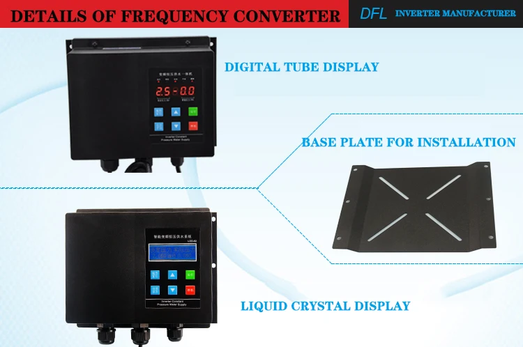 Специальный преобразователь частоты DFL3000M (220V) и DFL4000M (380V) рюкзак типа постоянного давления водоснабжения интегрированные машины является специальный преобразователь частоты для водоснабжения, который может быть непосредственно установлен на задней части насоса; С функциями контроллера постоянного давления и общего преобразователя частоты. Продукт имеет характеристики простой установки и обслуживания, удобную работу для пользователей, интеллектуальное постоянное давление, хорошую водонепроницаемость и красивый внешний вид;