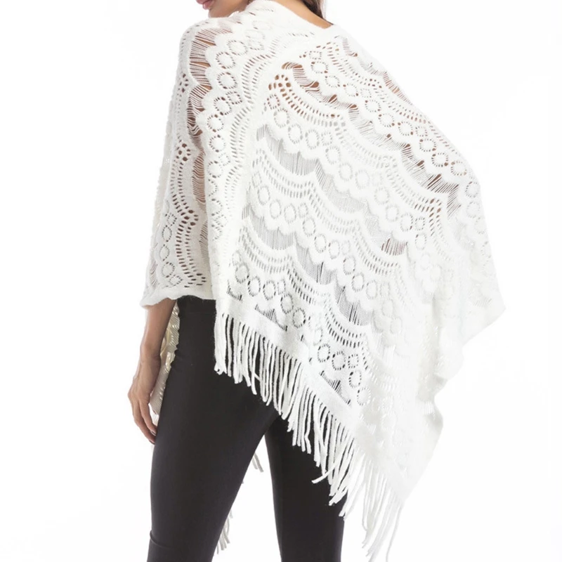 Ажурный вязаный крючком, простой однотонный цвет, асимметричный подол с бахромой и асимметричным низом.