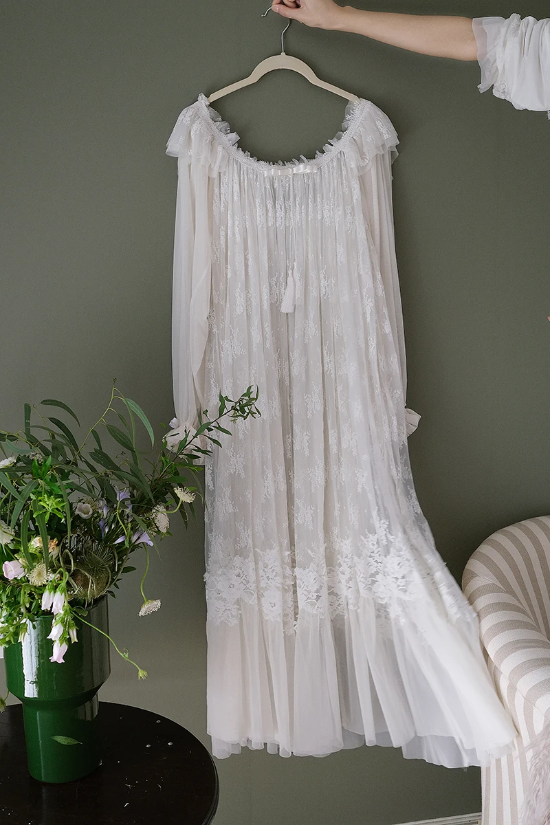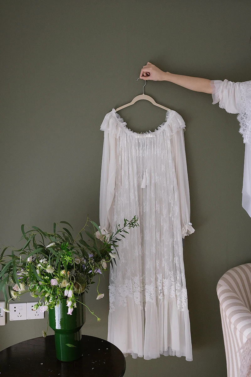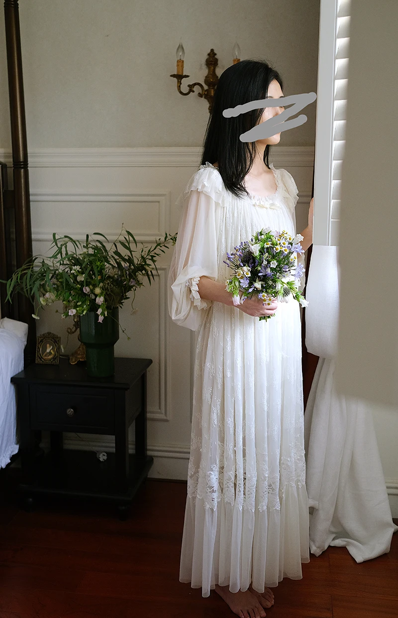 Эта ночная рубашка состоит из двух слоев, нижний слой изготовлен из хлопка, снаружи-из мягкой марлевой ткани, с мягкой тонкой вышивкой, элегантная и винтажная.