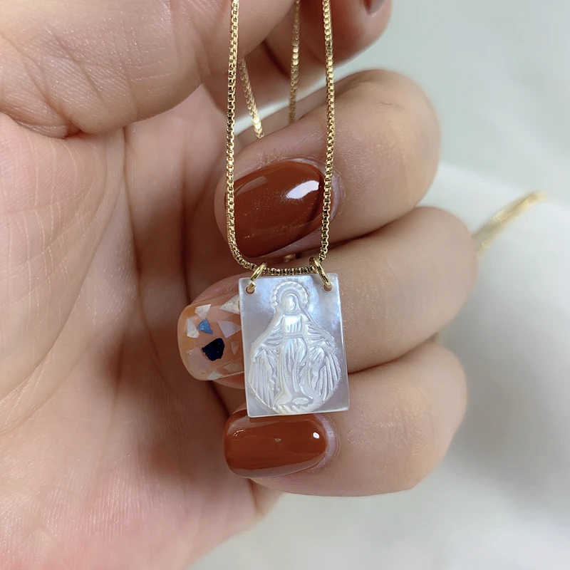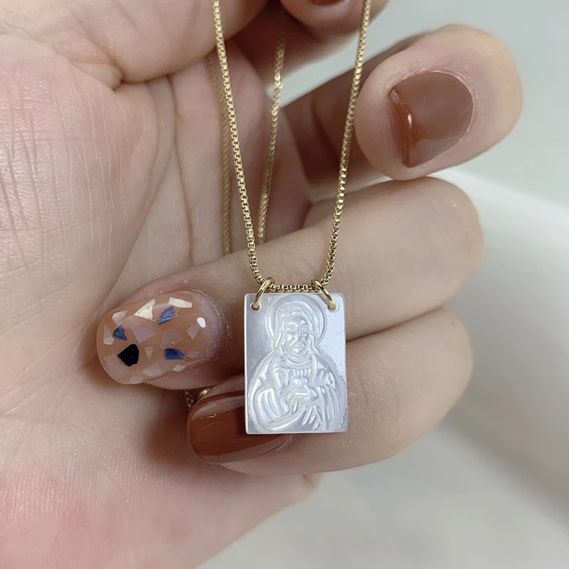 Ожерелье с религиозными верами Материал: перламутровый корпус, медь Процесс: Позолота 18k, резьба Размер: цепочка 45 см, подвеска 12*16 мм