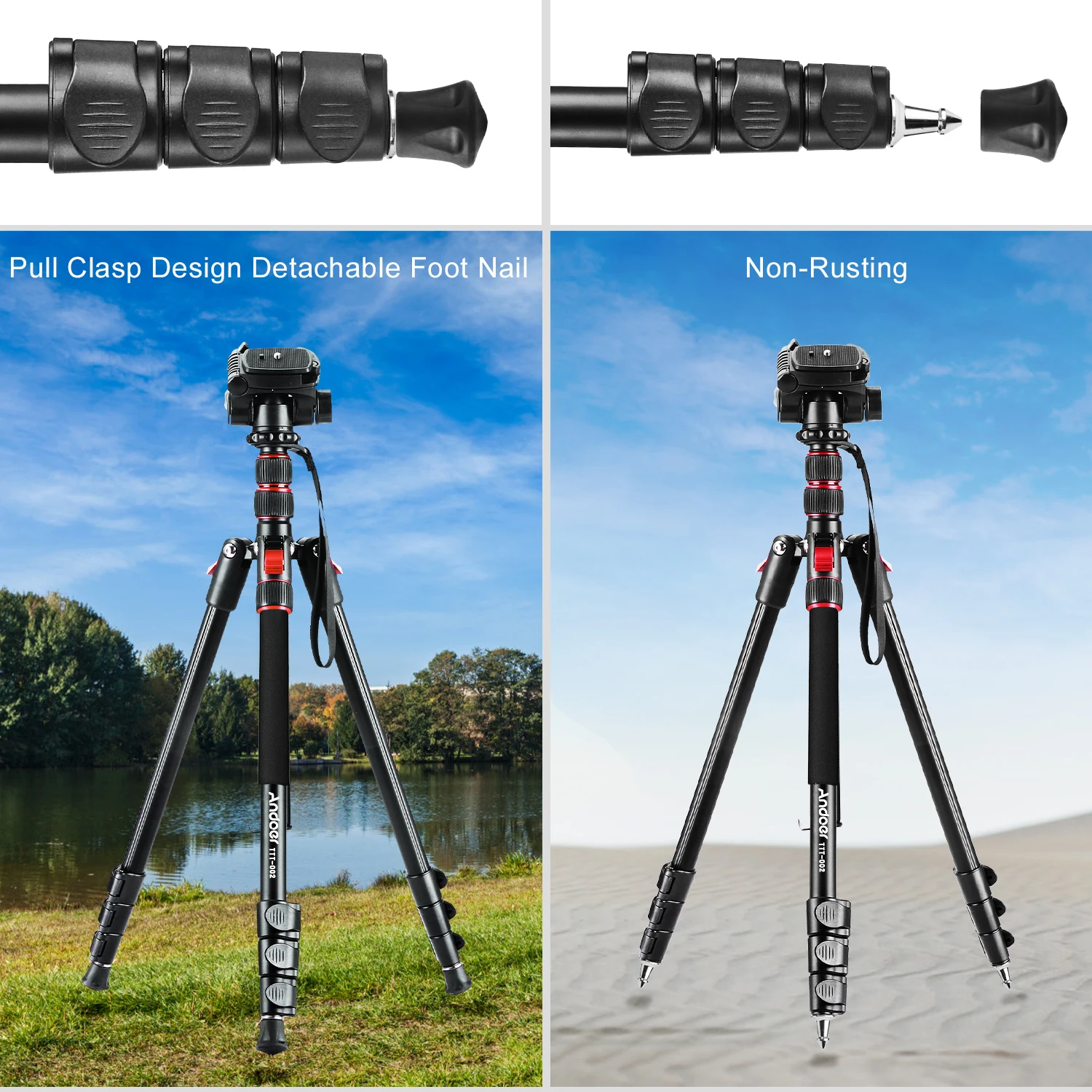 Гибкое и стабильное использование:4-х секционная телескопическая ножки с 3 быстрое освобождение флип-замки для быстрого и удобного открытия, позиционирования и закрытия; нескользящие резиновые ножки и центральный крючок для подвешивания дополнительного веса могут повысить стабильность штатива.