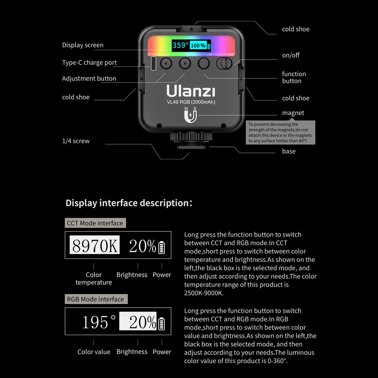 Несколько способов использования:3 крепления для холодного башмака позволяют использовать несколько светильник ильников вместе для получения более высокой яркости; Переходник для холодного башмака с нижней 1/4 дюймовой резьбой и магнитной конструкцией задней стороны позволяет закрепить светильник ку к камере, штатив или другие магнитные предметы легко.