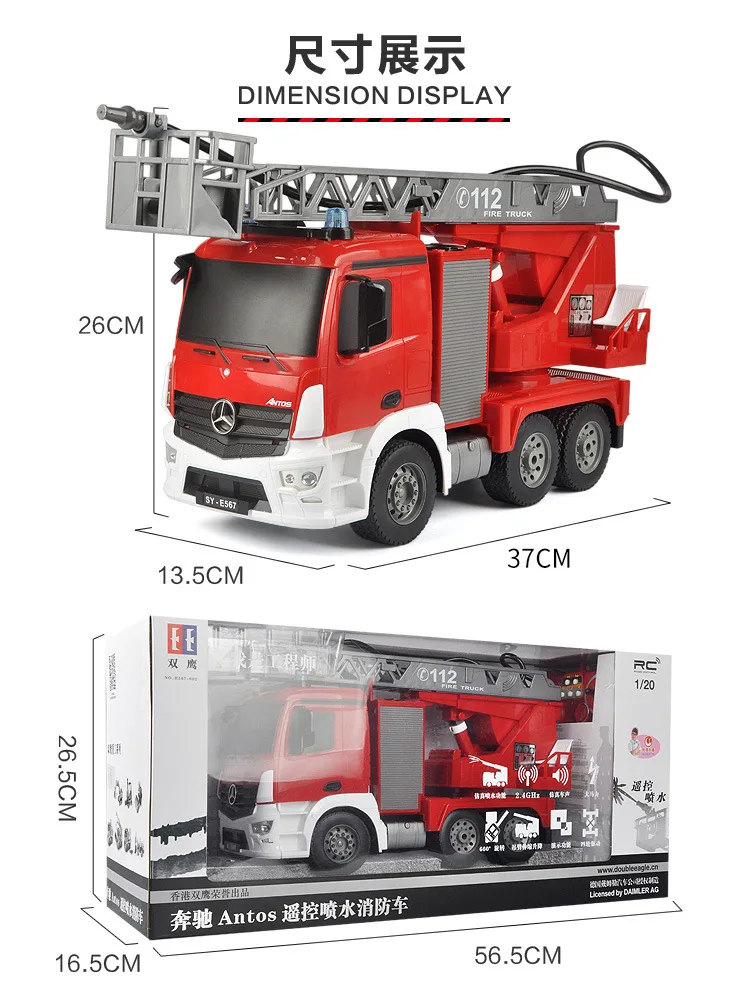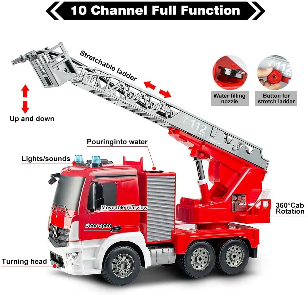 【10-канальный полностью функциональный 】 имитация распыления воды (до 4 метров), лестница вверх/вниз, лестница растягивается/отводится назад, вращение на 360 градусов, вперед/назад, поворот влево/вправо, рабочие звуки, отключение звука светодиодный светодиодные лампы (мощсветильник, передний и задний свет, сигнализация)
