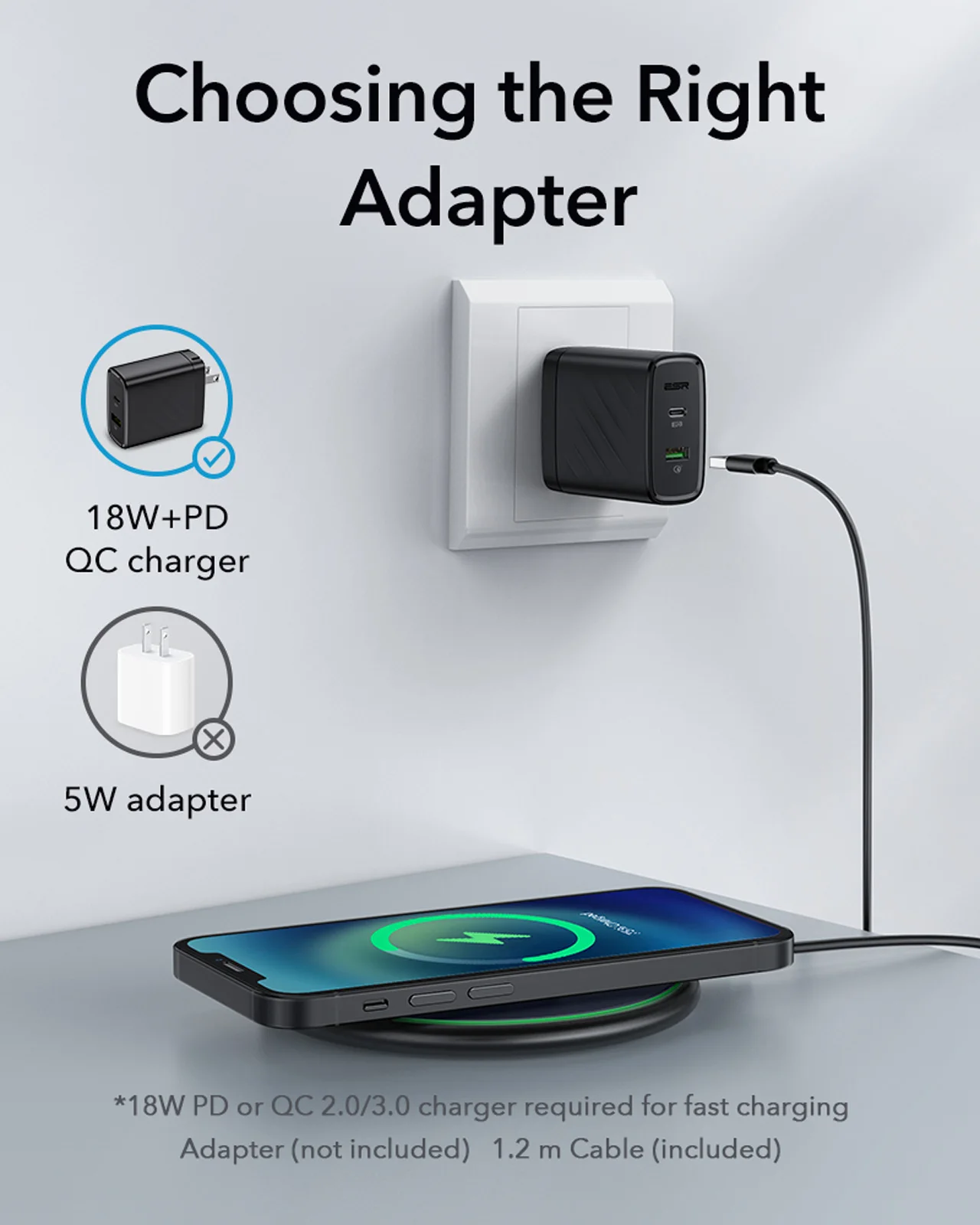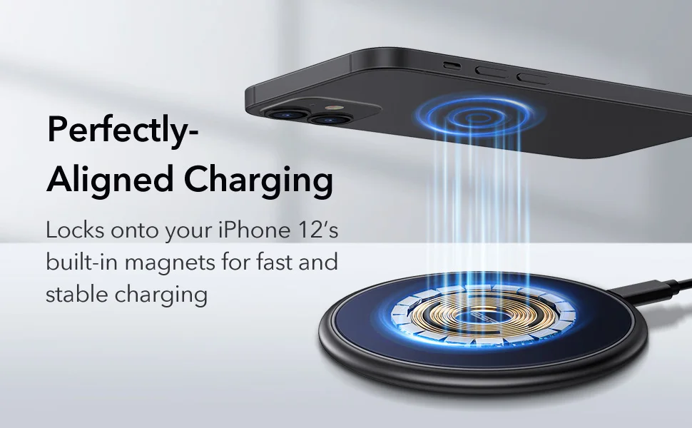 El Anillo magnético HaloLock mantiene Tu iPhone 12 perfectamente centrado en la almohadilla de carga Para una carga más rápida Y consistente. Примечание: El Cargador de pared PD нет está incluido.