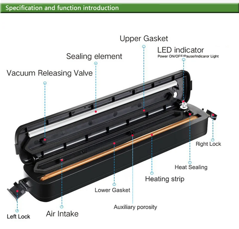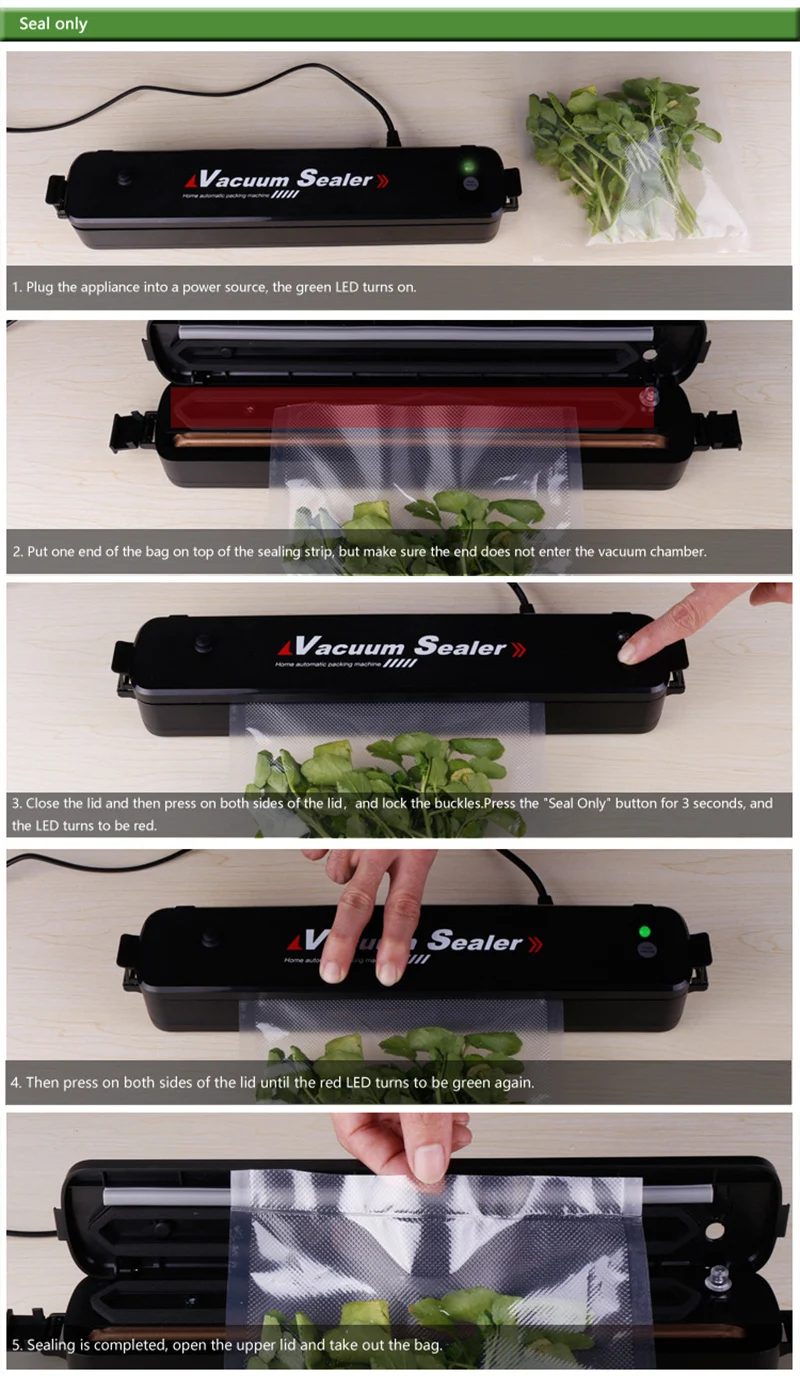 Параметр: Модель: LP-11 Напряжение: переменный ток 110-120 В/60 Гц 220-240 В/50 Гц Мощность: 90 Вт G.W.: 0,7 кг Размер изделия: 37*7*5,2 см Вакуумные пакеты: L25 * 20 см (15 шт.) Степень вакуума: -45 кПа/-60 кПа Преимущества Prodcut: 1. Компактная вакуумная система запечатывания устраняет ожоги морозильной камеры, уменьшает порчу и пищевые отходы. 2. Свежие, антибактериальные, влагостойкие, устойчивые к плесени, антиоксиданты. 3. Один сенсорный вакуумный упаковщик, прост в использовании. 4. Низкий уровень шума, низкая вибрация. Вакуумная упаковка и безопасность пищевых продуктов Вакуумная упаковка продлевает срок службы продуктов, удаляя большую часть воздуха из герметичной Контейнеры и предотвращает попадание свежего воздуха в герметичные контейнеры, тем самым уменьшая Окисление. Вакуумная упаковка помогает сохранить вкус и общее качество. Это также помогает Препятствует росту аэробных микроорганизмов, что может привести к проблемам, отмеченным ниже При определенных условиях: 1.Пресс-форма-Форма не может расти в условиях низкого содержания кислорода; Поэтому вакуумная упаковка может Практически устраняет его. 2.Дрожжи-Результаты ферментации, которые могут быть идентифицированы по запаху и вкусу. Дрожжи Для роста требуется вода, сахар и умеренная температура. Он также может пережить с или без Воздух. Замедление роста дрожжей требует охлаждения, в то время как замораживание останавливает его Полностью. 3.Бактерии-Приводит к неприятному запаху, обесцвечиванию и/или мягкой или скользкой текстуре. При правильных условиях клостридий ботулин (организм, который вызывает ботулизм) может Растут без воздуха и не могут быть обнаружены по запаху или вкусу. Хотя это чрезвычайно редко, Это может быть очень опасно. Как вакуум и уплотнение с сумками 1. Поместите предметы в сумку. Очистите и расправьте открытый конец сумки, очистите Удаляет пыль и разглаживает морщины или рябь. 2. Поместите открытый конец мешка в вакуумную камеру под воздухозаборником. Не нужно Наполняйте мешок. 3. Закройте крышку, а затем нажмите на обе стороны крышки и зафиксируйте пряжки. 4. Нажмите кнопку "вакуум и уплотнение" и зеленый светодиодный мигнет, сумка будет Автоматически пылесосить. 5. Когда светодиодный индикатор станет красным, сумка будет автоматически морской светодиодный. 6. Когда светодиодный индикатор снова станет зеленым, процесс будет завершен. 7. Откройте вакуумный клапан и отпустите вакуумное давление внутри машины. 8. Откройте верхнюю крышку и выньте сумку. Охладить или заморозить герметичный мешок для еды, если Необходимо. Только уплотнение 1. Подключите устройство к источнику питания, включается зеленый светодиодный индикатор. 2. Положите один конец мешка поверх уплотнительной ленты, но убедитесь, что конец не Введите вакуумную камеру. 3. Закройте крышку, а затем нажмите на обе стороны крышки и зафиксируйте пряжки. Кнопка «только уплотнение» в течение 3 секунд, светодиодный индикатор становится красным. 4. Затем нажмите на обе стороны крышки, пока красный светодиодный индикатор не станет зеленым. 5. Герметизация завершена, откройте верхнюю крышку и выньте сумку. Очистка и техническое обслуживание Перед очисткой устройства всегда отключайте устройство. Не погружайте его в воду или любую другую жидкость. Не используйте абразивные чистящие средства для очистки устройства, так как 
