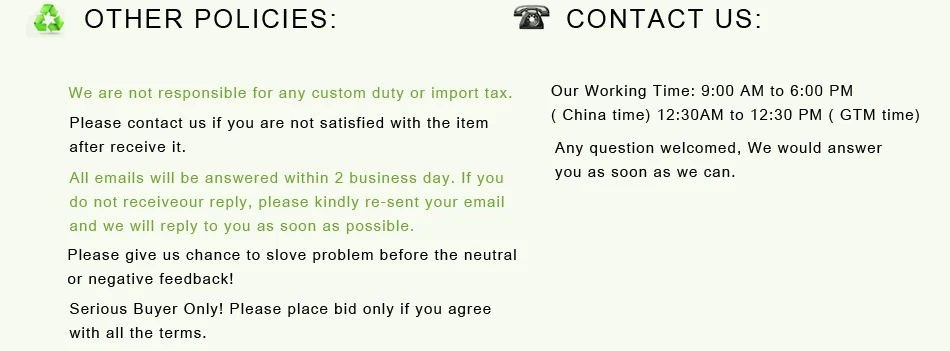 2. Мы постоянно совершенствуем эффекты фотографии, но из-за различных параметров камеры и монитора, освещения и других факторов, все еще трудно избежать разницы в цвете между реальным предметом и фотографией, поэтому, пожалуйста, обратитесь к фактическому цвету.