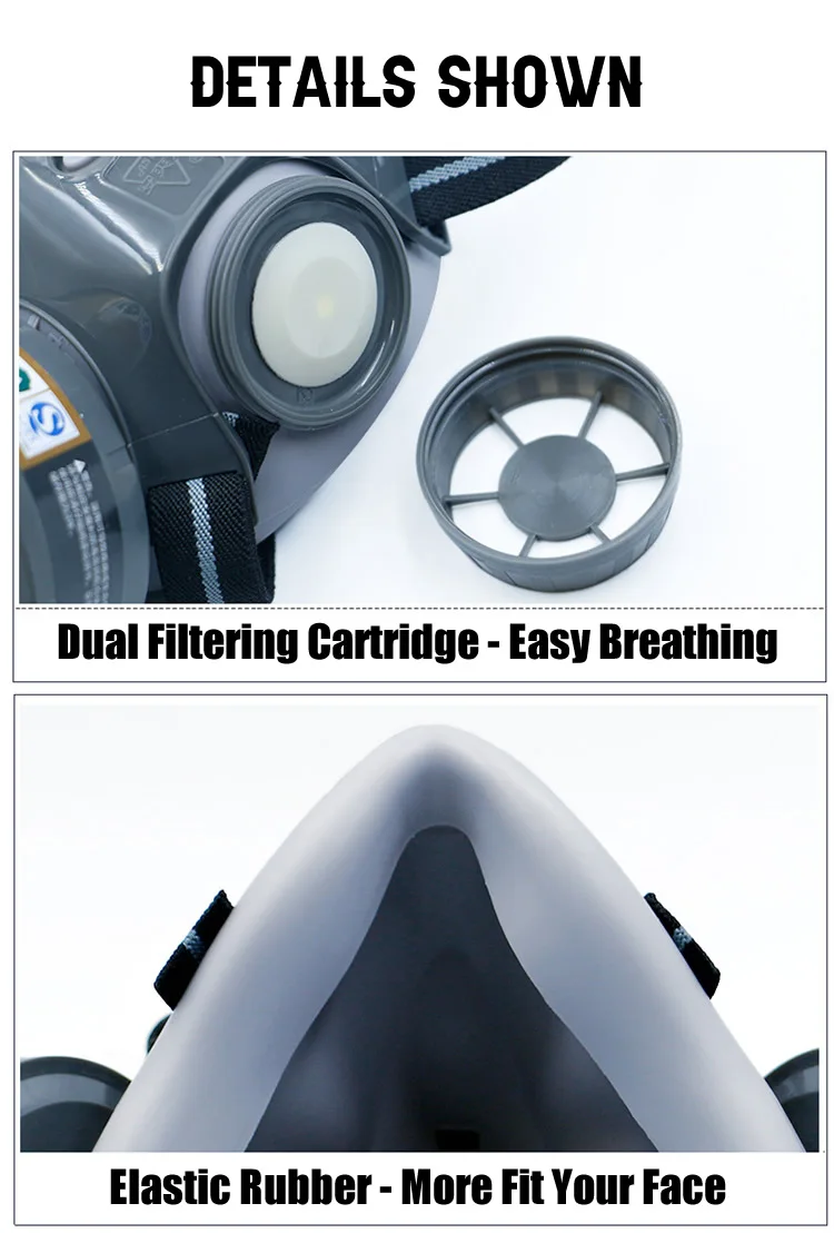 * Абсолютно новый и высококачественный * Полумаска для лица с двойными фильтрующими картриджами, дыхательным клапаном. * Корпус маски изготовлен из высококачественного материала, имеет высокую эластичность и не образуется даже после экструзии, более удобно носить и соответствовать вашему лицу. * Регулируемый 2-точечный ремень на голову, легко устанавливать и регулировать, что гарантирует удобство при носке и подходит для большинства людей. * Высококачественный дыхательный клапан и использует технологию двойного запечатывания для улучшения герметичности * Подходит для предотвращения органических паров, бензола homologs, бензина, ацетона, дисульфида углерода и др. * Используется для окраски, распыления пестицидов, химической промышленности, фабрики, горнодобывающей промышленности, лаборатории, установки дома, ежедневной защиты от дымки. * Примечание: Если вы почувствуете специфический запах после использования в течение определенного периода, это означает, что частицы углерода насыщены, вам нужно заменить на новые частицы углерода.