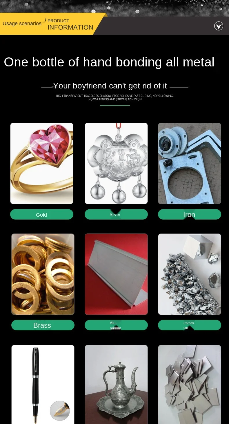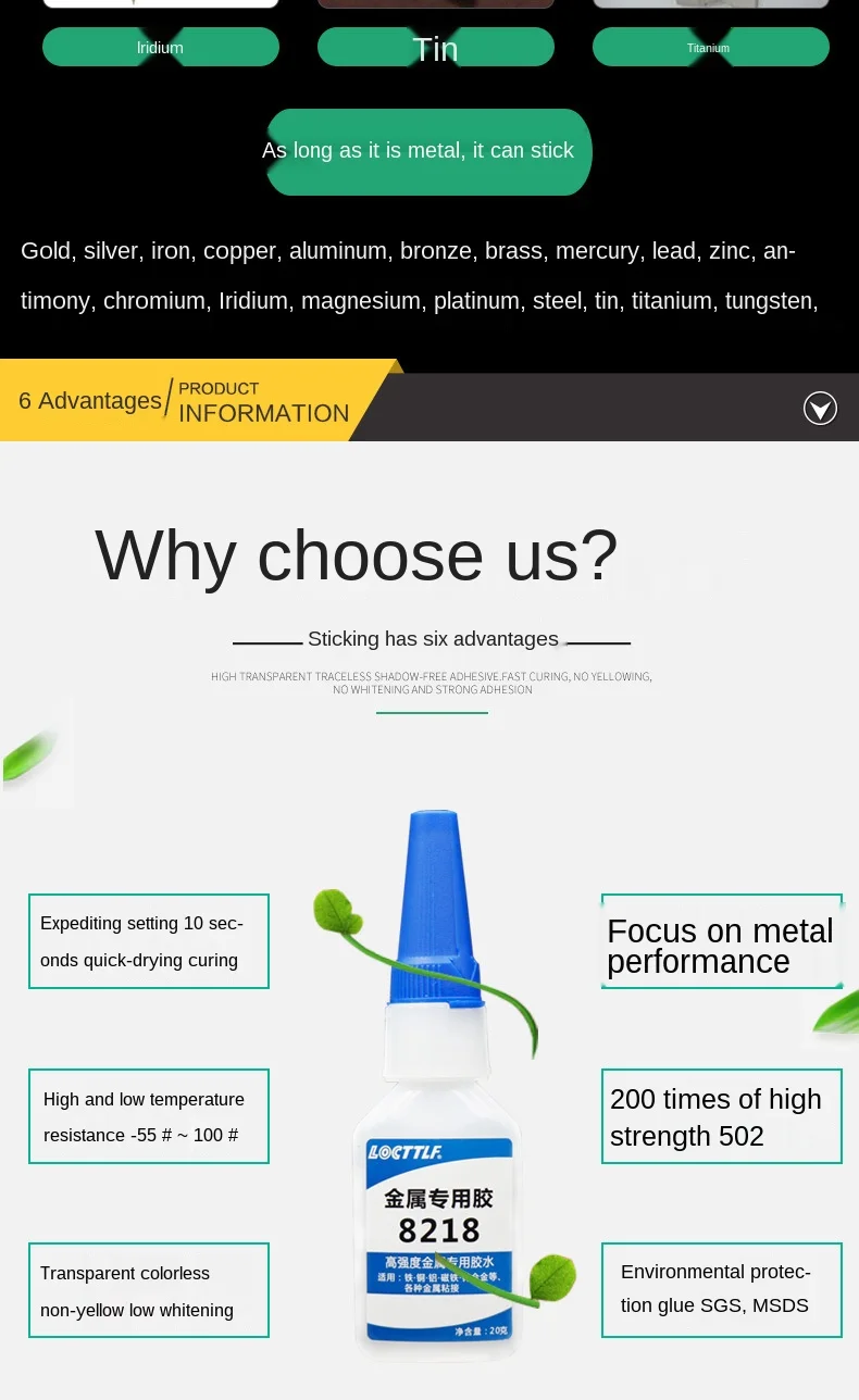 Информация о продукте:Этот клей является специальным клеем для металла, высокопрочного и быстросохнущего клея. Прозрачный и бесцветный, не желтеет и не отбеливает, в 200 раз больше 502. Подходит для всех металлов.